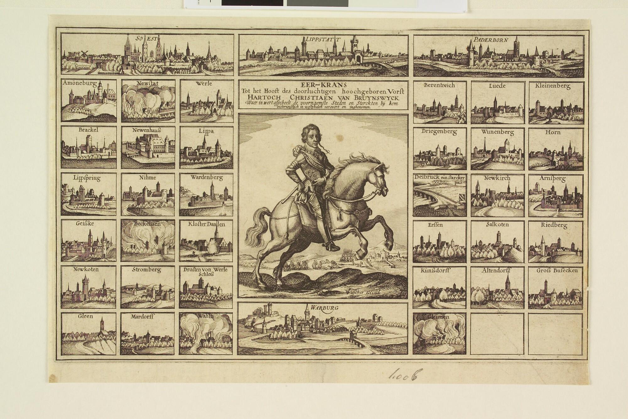 Portret van hertog Christiaan van Brunswijk te paard, omgeven door 38 afbeeldingen van door hem veroverde steden, 1625.