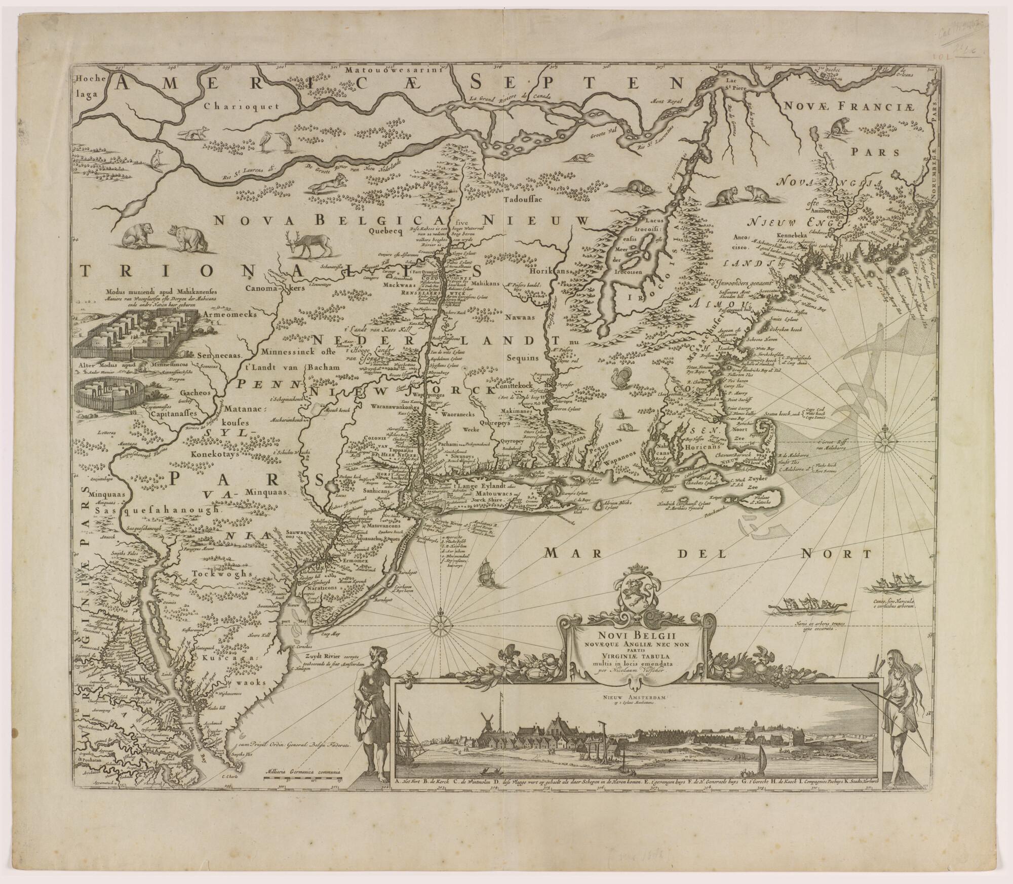 Kaart van Nieuw Belgie, Nieuw Nederland en een deel van Virginia. Uitgave Nicolaas Visscher (1639 - 1709), Amsterdam, 1684. Vierde staat met aanzicht van Nieuw-Amsterdam (met Philadelphia & privilege Staten Generaal). Schaal 1:2.250.000
