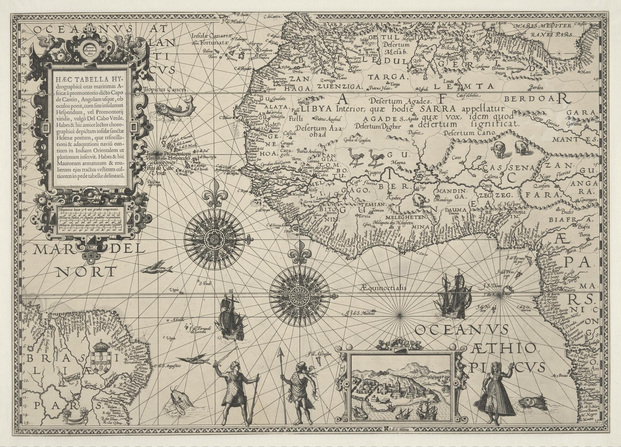 Kaart van de Atlantische Oceaan en Afrika van Petrus Plancius (1552 - 1622). Gravure Johannes van Doetecum (werkzaam 1592 - +1630), uitgave, 1610. Met afbeelding van St Helena. De latijnse titel is ingeplakt. Eerste staat (schaal 1 op 15.000.000).
