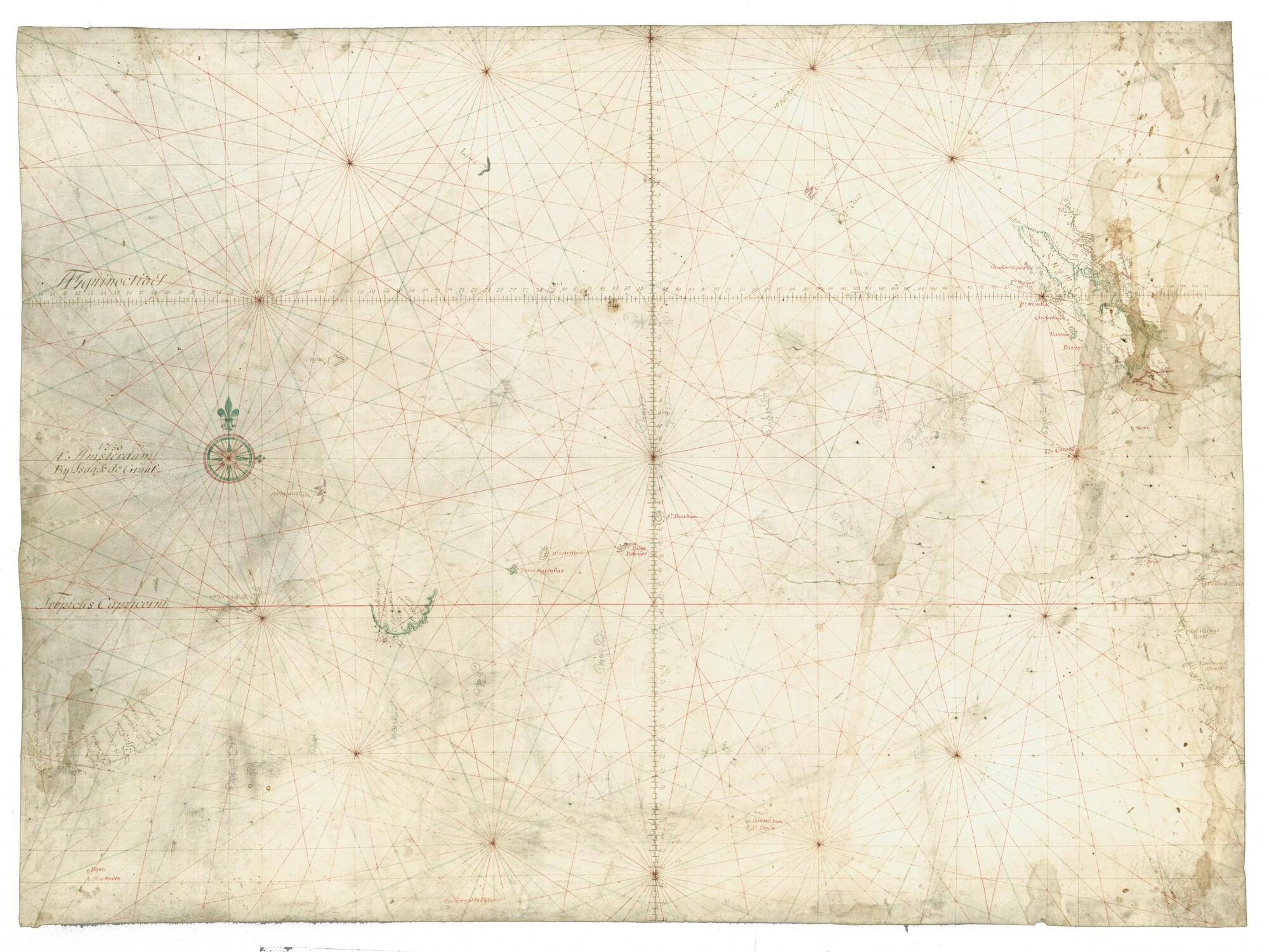 Zeekaart van de Indische Oceaan met een deel van de zuidkusten van Afrika en Madagaskar, Sumatra en een deel van de westkust van Australië. Handschrift op perkament door Isaak de Graaf, Amsterdam, 1730. Bevat middagposities en koerslijnen van reizen van Straat Soenda naar richting Ceylon/India, van Kaap de Goede Hoop naar Straat Soenda en van ...