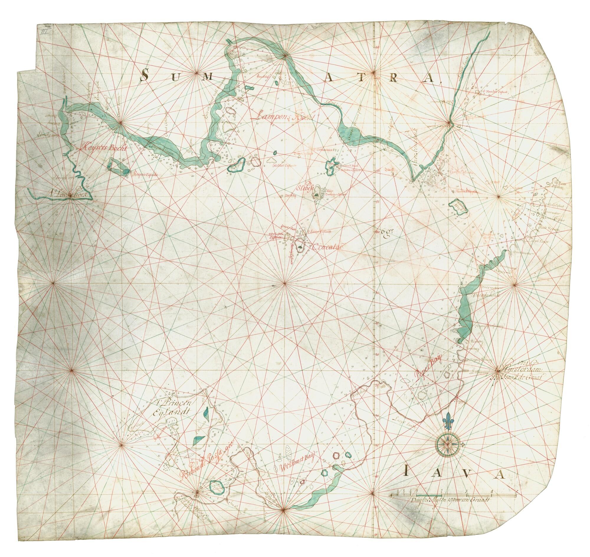Zeekaart van Straat Sunda door Isaak de Graaf, Amsterdam, 1724. De kaart bevat een aantal koerslijnen (schaal 1 op 200.000).