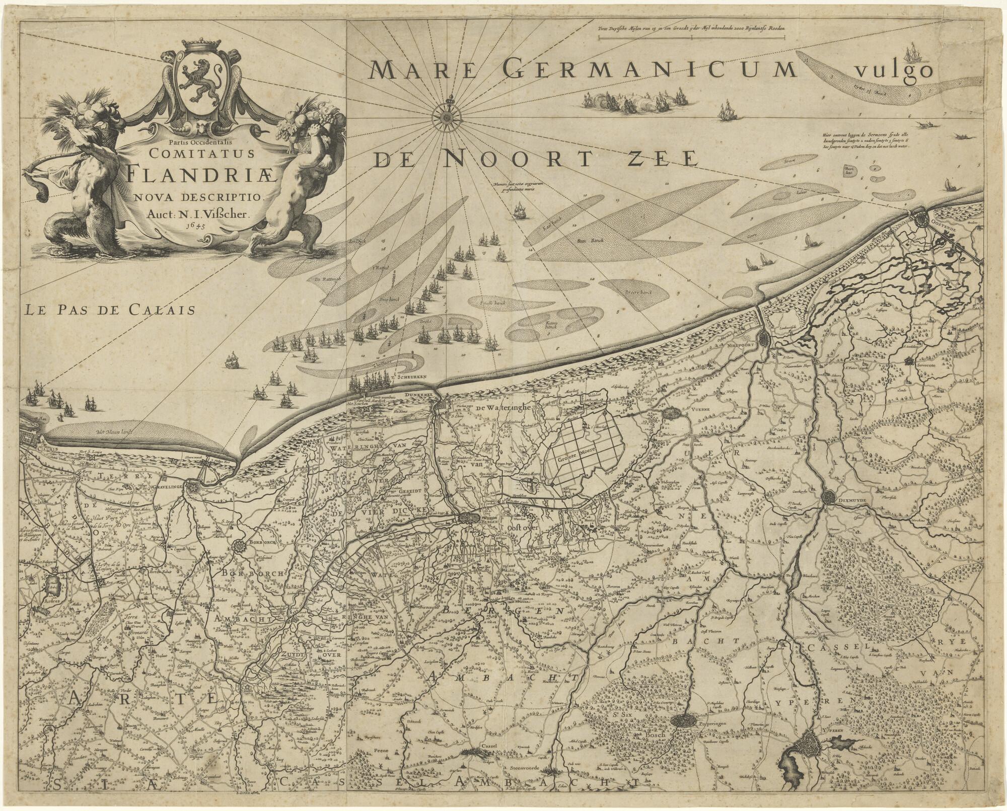 Kaart van het westelijk gedeelte van Vlaanderen, opnieuw beschreven door Nicolaas Jansz Visscher (1618 - 1679) te Amsterdam, 1645.