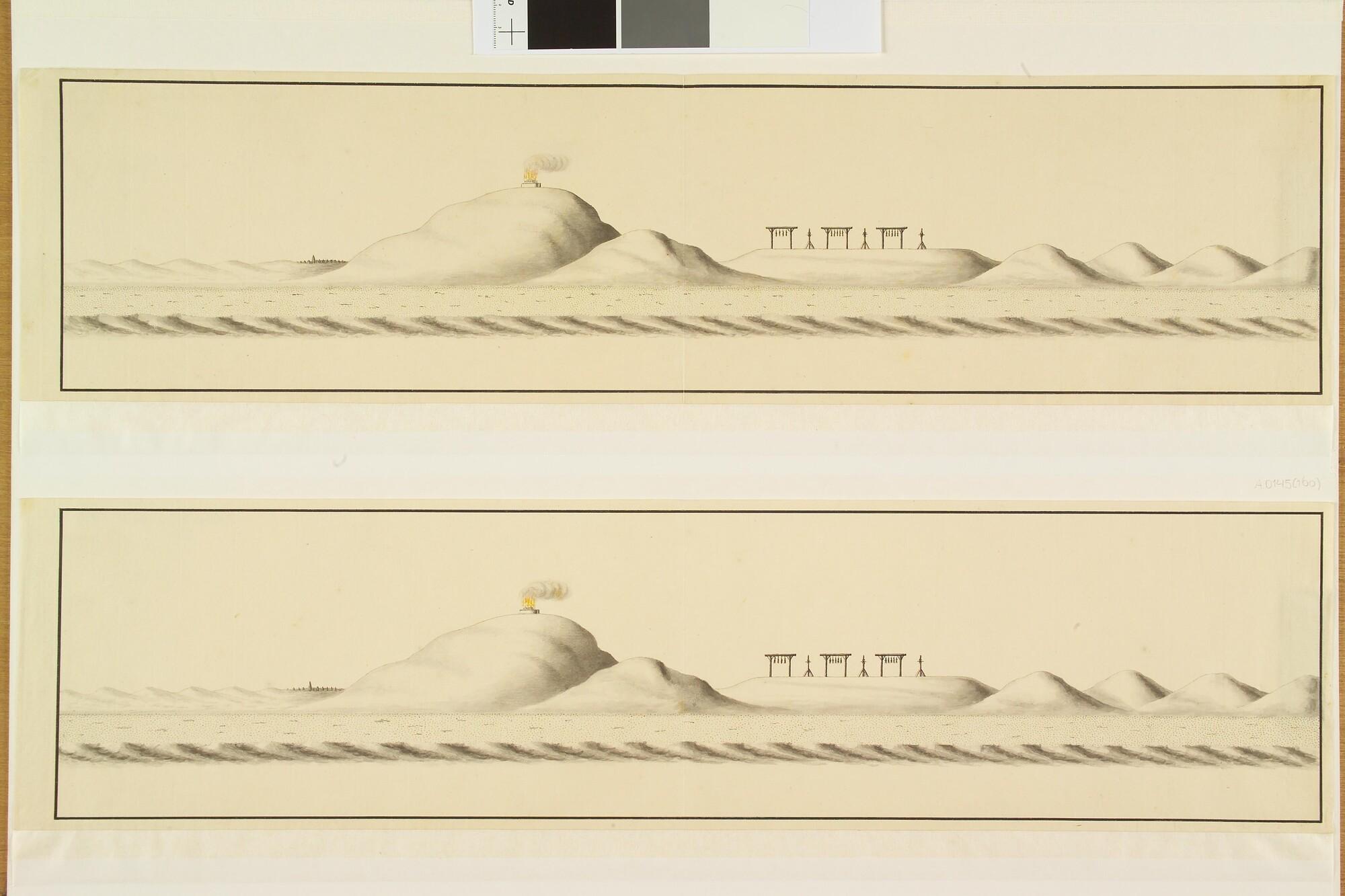Lichamen van de muiters van het Oostindisch Compagnieschip "Nijenburg" ten toon gesteld in beugels en op palen bij Kijkduin.