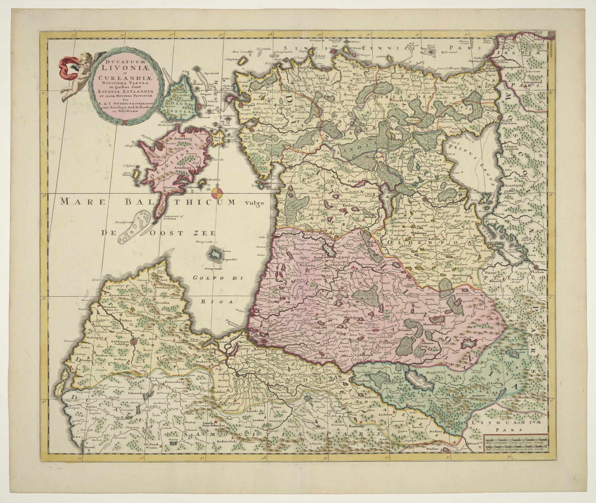 Met de hand gekleurde kaart van Estland en Letland aan de Oostzee, circa 1730. Uitgave Reinier en Joshua Ottens (1725-1750) Amsterdam, circa 1730. Lengte t.o.v. de meridiaan van Kaap Verde. Met privilege van de Staten van Holland & Westfriesland (schaal 1 op 1.000.000).