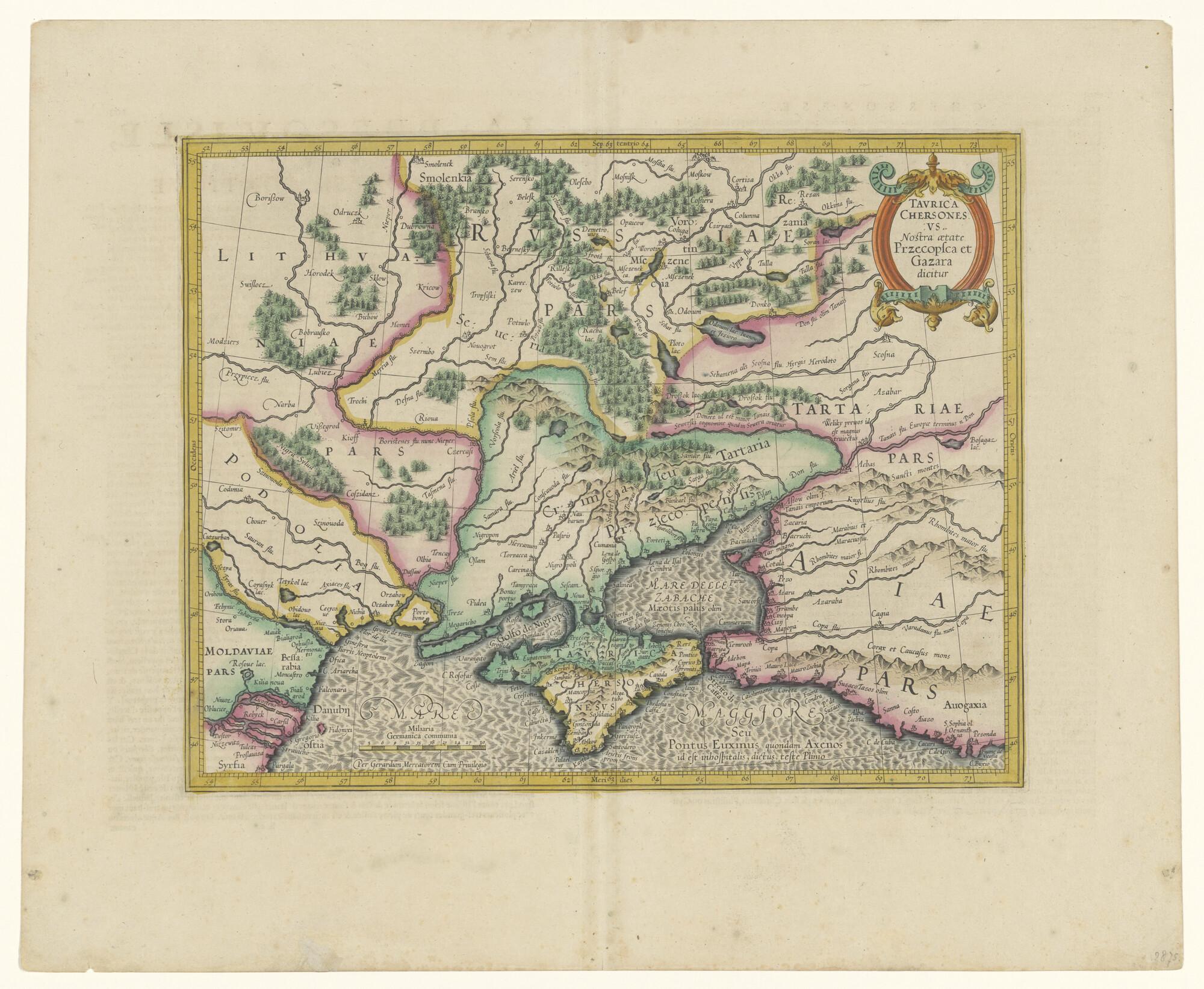 Met de hand gekleurde kaart van Oost-Europa benoorden de Zwarte Zee door Gerardus Mercator, met Latijnse tekst, uit de Franse uitgave van de Mercator-Hondius atlas van 1619. Lengte t.o.v. de meridiaan van Teneriffe ? (schaal 1 op 3.600.000).