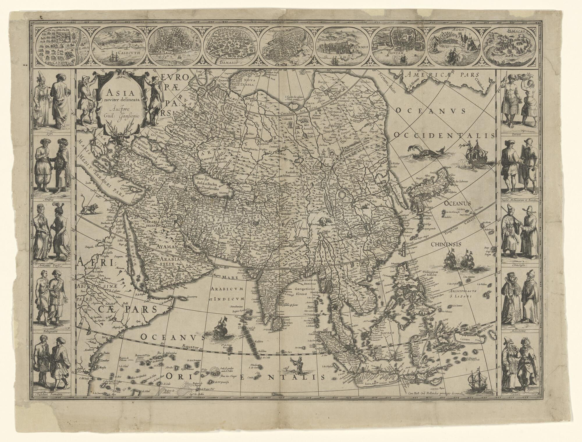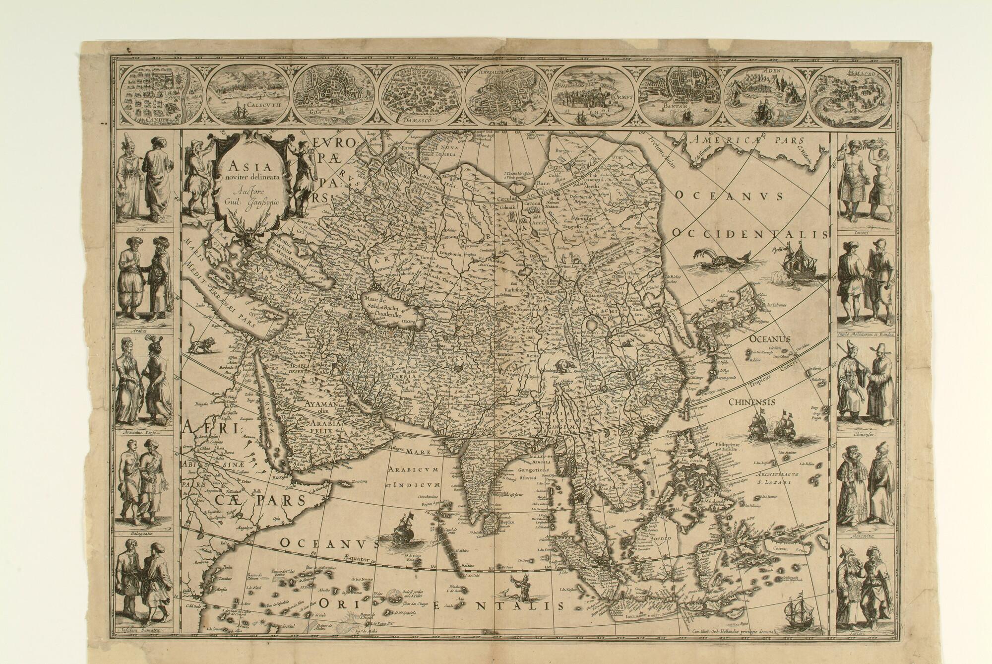 Kaart van Azië door Willem Jansz. (Blaeu), Amsterdam 1617. Met in de rand afbeeldingen van klederdrachten en plattegronden van verschillende steden. Met privilege van de Staten van Holland (schaal 1 op 20.000.000).