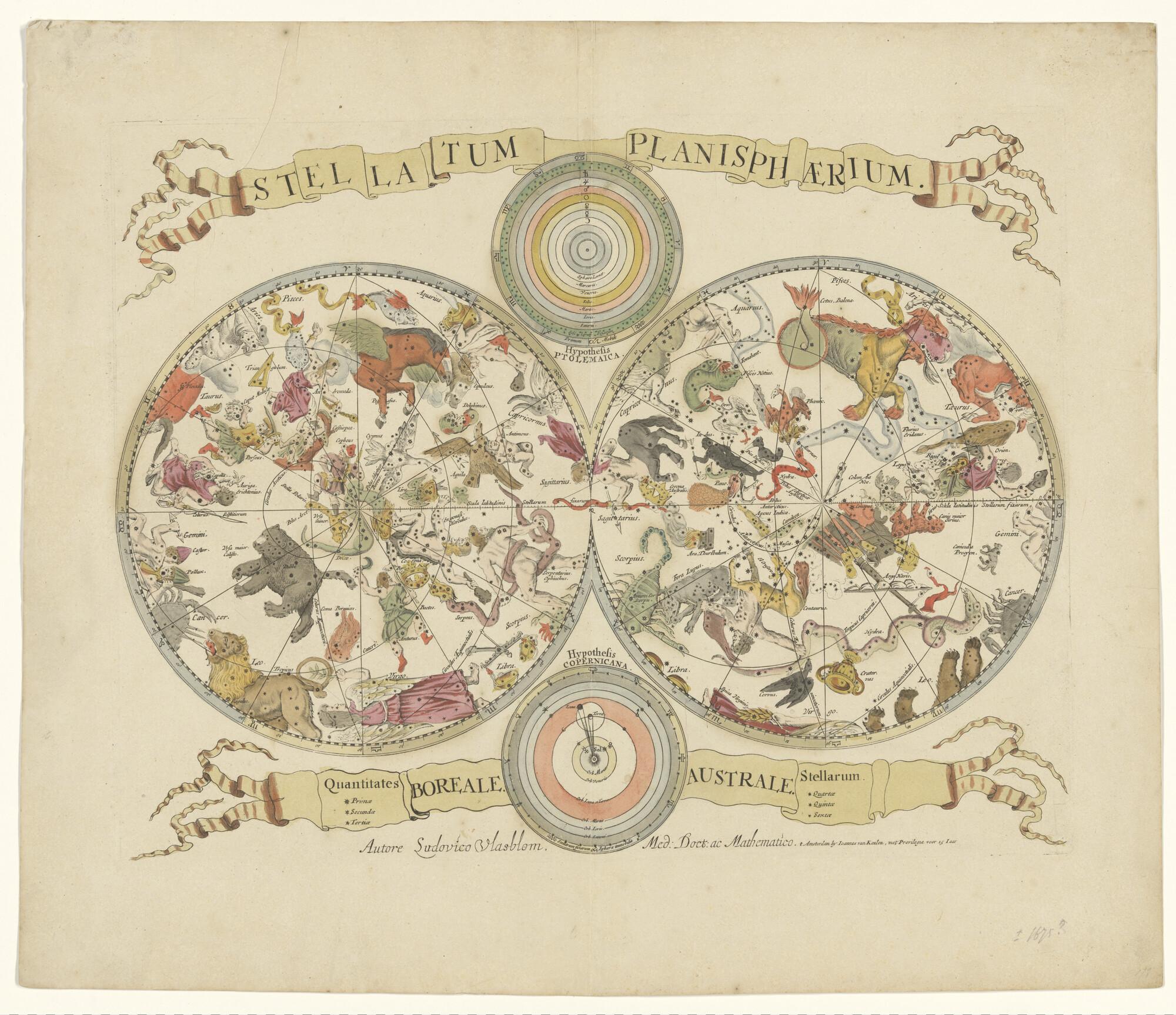 Sterrenkaart van noordelijke en zuidelijke sterrenhemel, omstreeks 1680, door Ludovico Vlasblom.