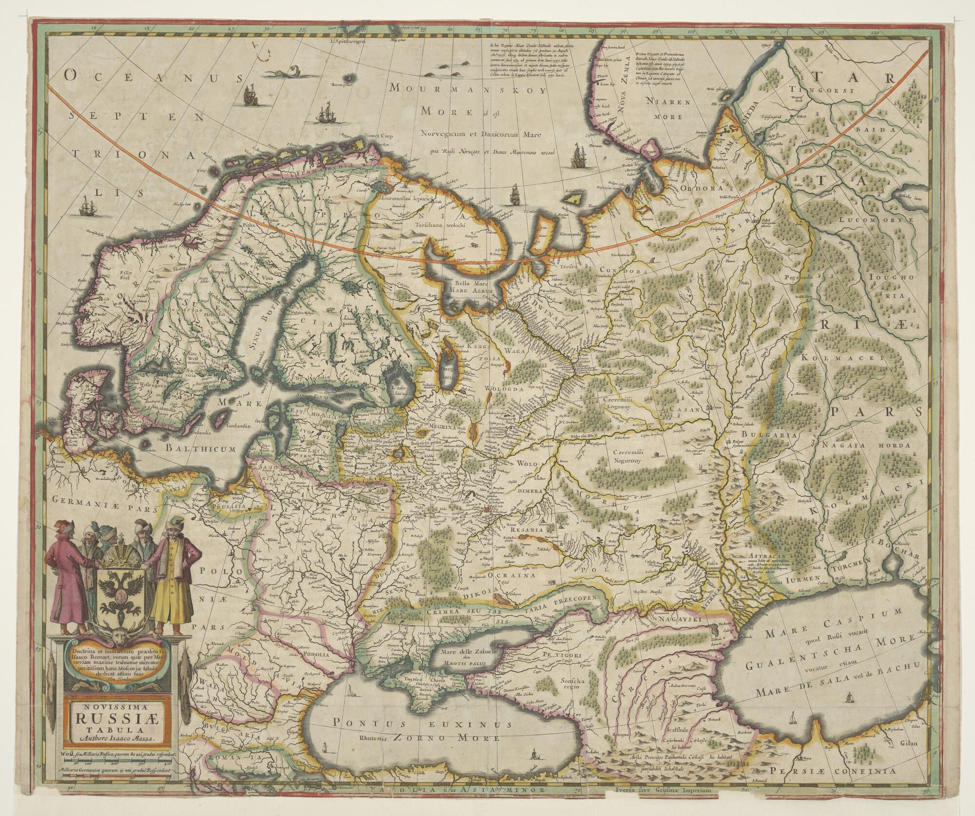 Met de hand gekleurde kaart van Rusland en noordwest Europa door Isaac Massa (1586 - 1643), circa 1633 uitgegeven door Henricus Hondius (15 - 1651) te Amsterdam en opgedragen aan Isaaco Bernart. Lengte t.o.v. de meridiaan van Teneriffe (schaal 1 op 8.000.000).