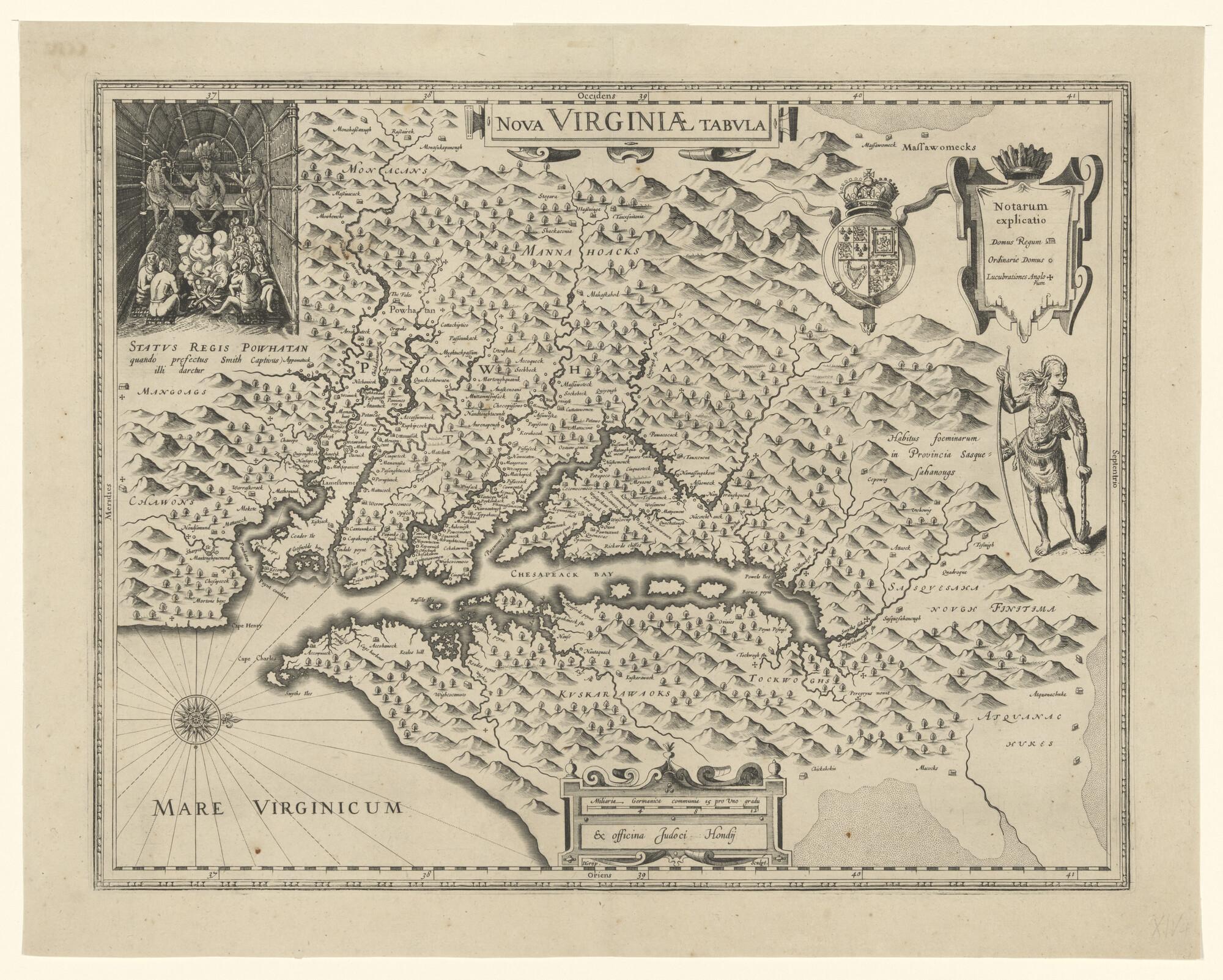 Kaart van Virginia in Amerika, gravure door Dirck Grijp, uitgave Judocus Hondius (1594 - 1629), Amsterdam, 1618. Gebaseerd op de kaart van Virginia van John Smith (1612). Met afbeelding van Powhatan-indianen tent. Eerste staat van deze kaart (schaal 1 op 1.100.000).