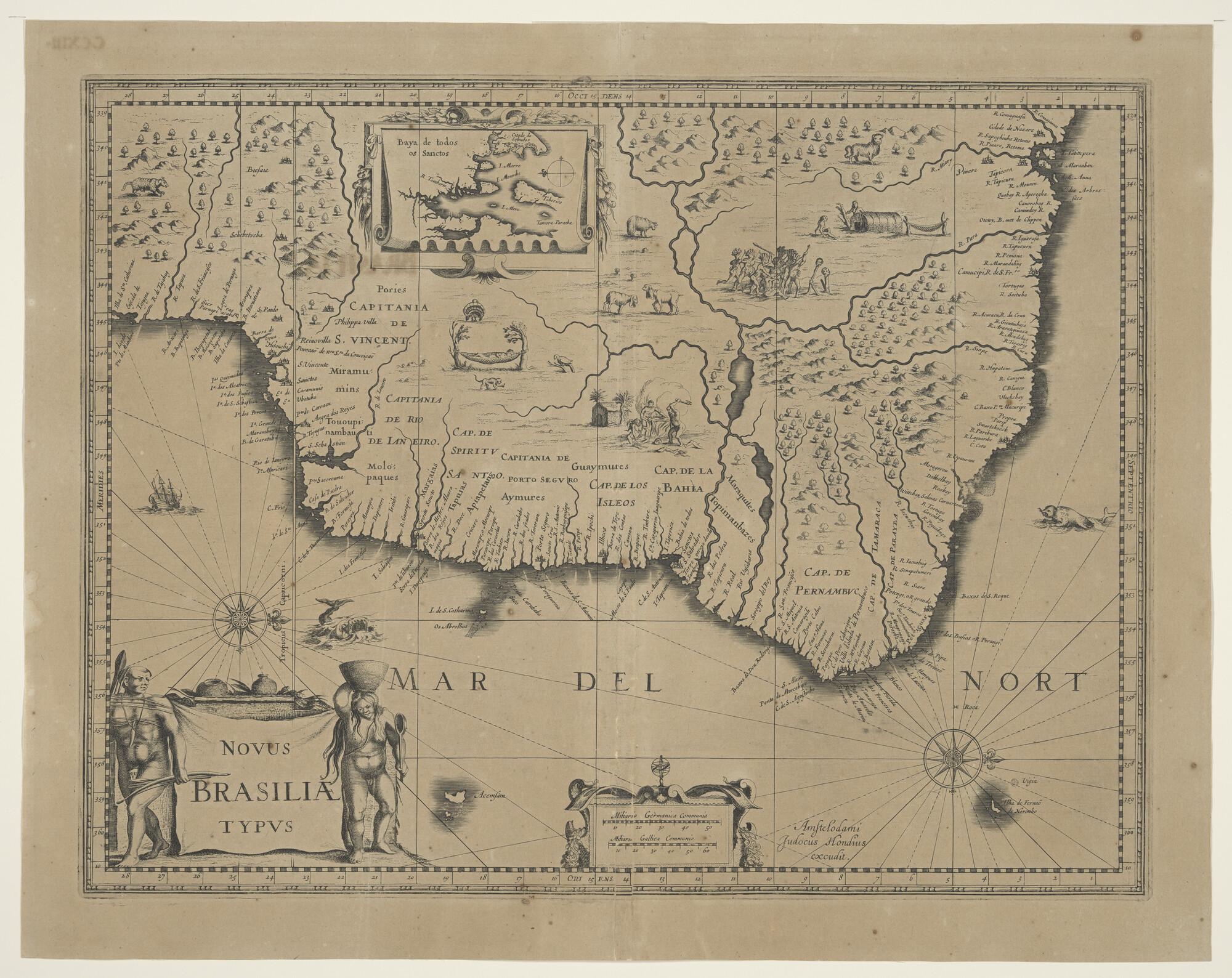 Kaart van Brazilië in Amerika, door Judocus Hondius (1594 - 1629), Amsterdam, circa 1630. Met inzet van de Baya de Todos y Sanctos (Allerheiligenbaai) (schaal 1 op 7.500.000).