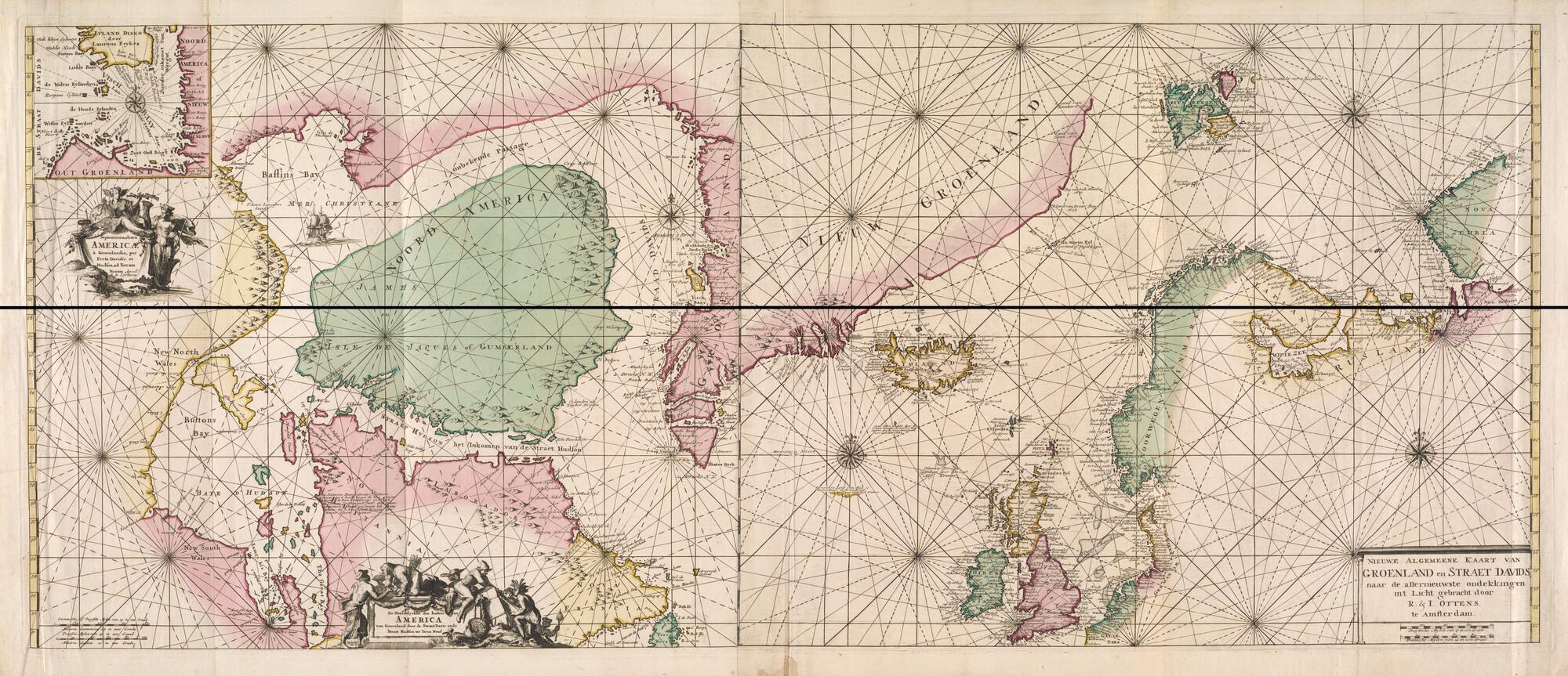 Gekleurde kaart van de Noord-Atlantische Oceaan in twee bladen, uitgegeven door Reinier en Josua Ottens. 1745. Het linkerblad bevat een detailkaartje van de Visbaai door Laurens Feykes Haan. Deze linkerhelft van de kaart is de vierde staat van een kaart die als eerste verscheen in de atlas van Frederik de Wit, Orbis Maritimus, ca. 1675. ...