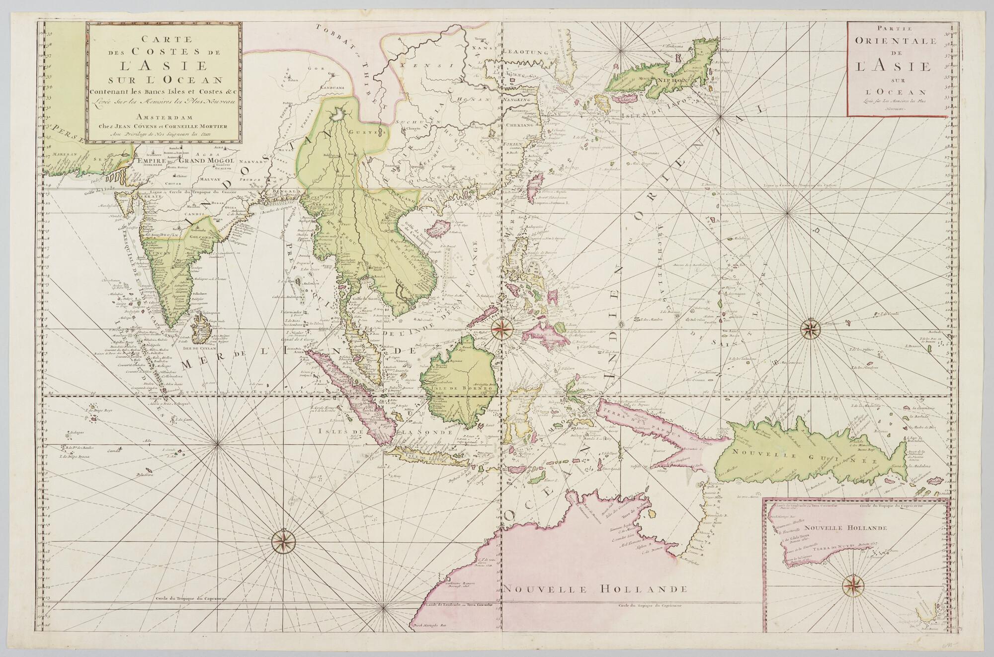 Met de hand gekleurde kaart van Azie, met detailkaart van Kaap Leeuwin en omgeving, uitgegeven te Amsterdam circa 1730, door J. Covens & C. Mortier (na 1711).