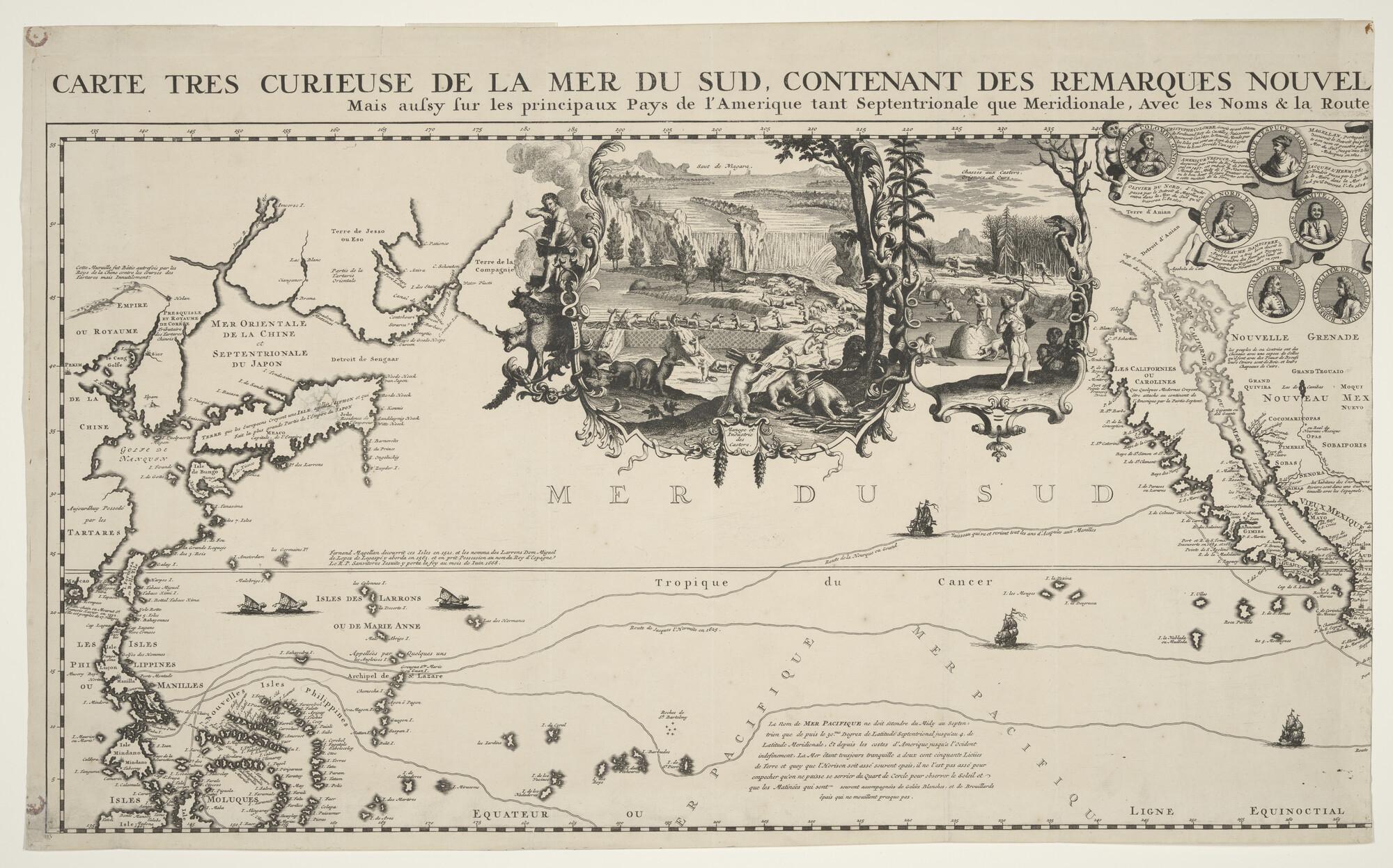 Kaart van de Stille en Atlantische Oceaan in vier losse ongemonteerde bladen, waarop de verschillende ontdekkingsreizen zijn aangegeven. Met afbeeldingen van ontdekkers t/m William Dampier (1712) en zeer veel graveerwerk aan de rand, met deelkaarten, afbeeldingen van volken etc. De kaart is in Mercator projectie en ongekleurd. De kaart is oorspronkelijk gepubliceerd in deel 7 ...