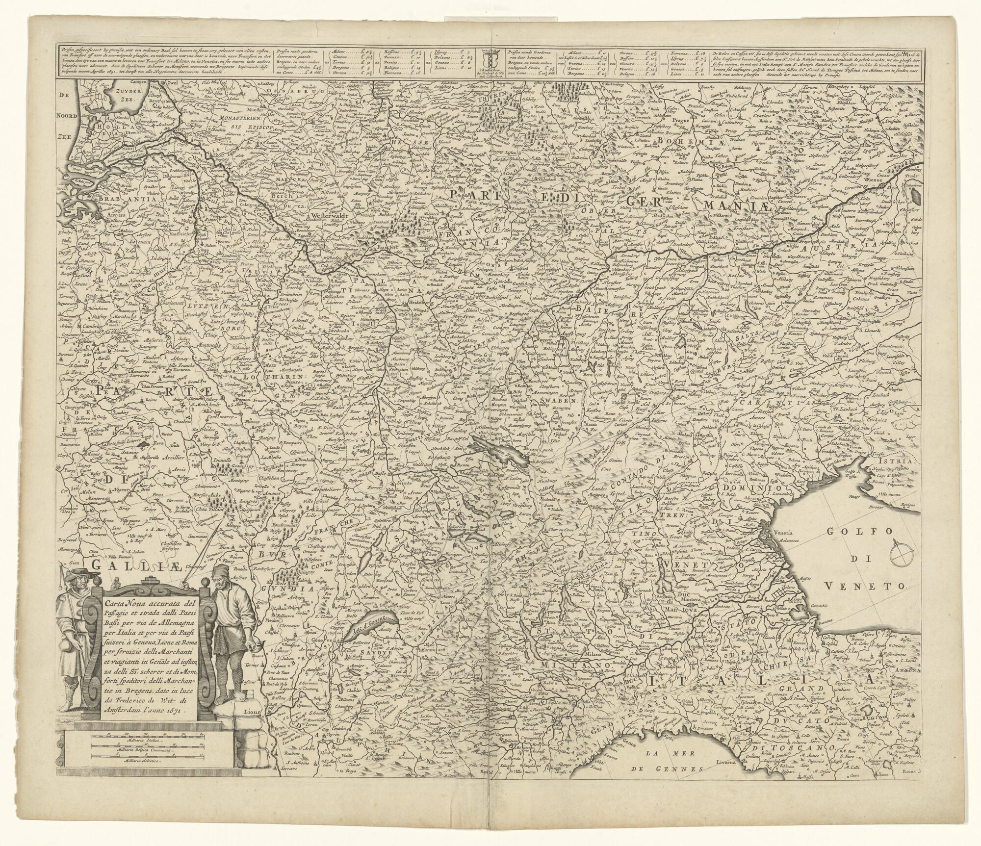 Met de hand gekleurde kaart van Noord Italië en Zuid Duitsland met gegevens over het reizen tussen die landen en gegevens omtrent de kosten van vervoer van goederen van Frankfort naar Milaan. Frederik de Wit (1610 - 1698), Amsterdam, 1671.