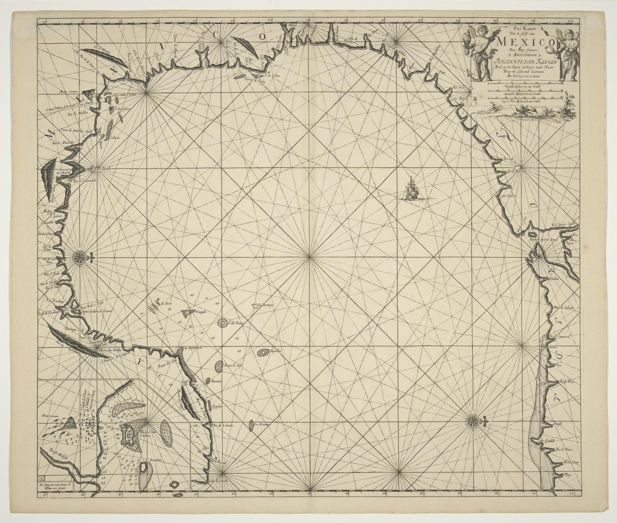 Paskaart van de Golf van Mexico, door Claas Jansz. Vooght (overleden 1696). Uitgave Johannes van Keulen (1654 - 1715) Amsterdam, circa 1712. Met detailkaart van de haven van Juan d'Ulhua.