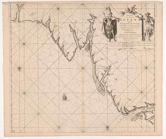 Paskaart van de kust van Guiana tussen de rivieren Cupanama en Orinoco en de rivieren Barbice, Demerary, Esequeba en Poumaron, door Claas Jansz. Vooght (overleden 1696). Uitgave Johannes van Keulen (1654 - 1715) Amsterdam, circa 1712.