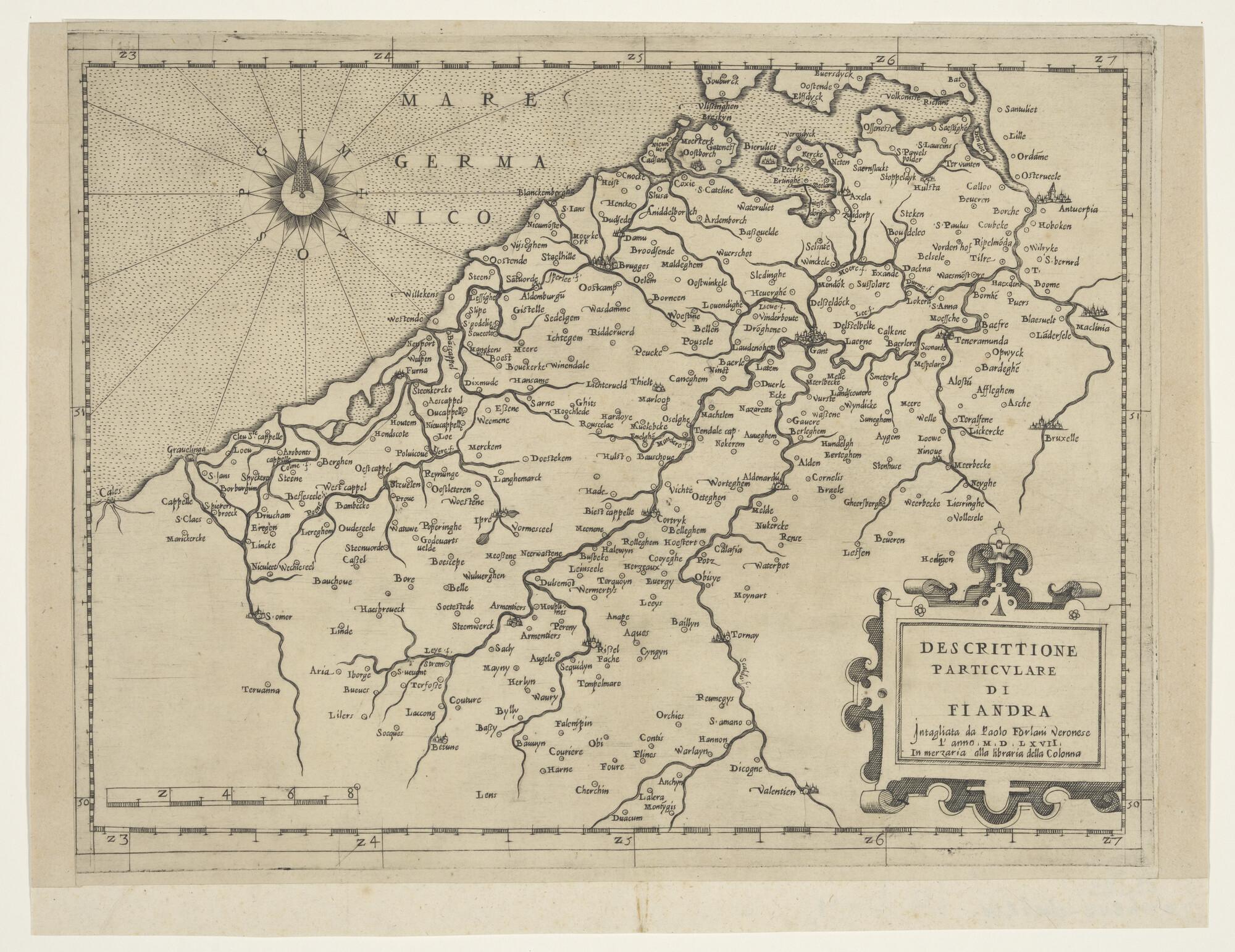 Kaart van Vlaanderen door Paolo de Forlani (werkzaam circa 1576 te Verona en Venetië. Verona, 1567 (schaal 1 op 900.000).