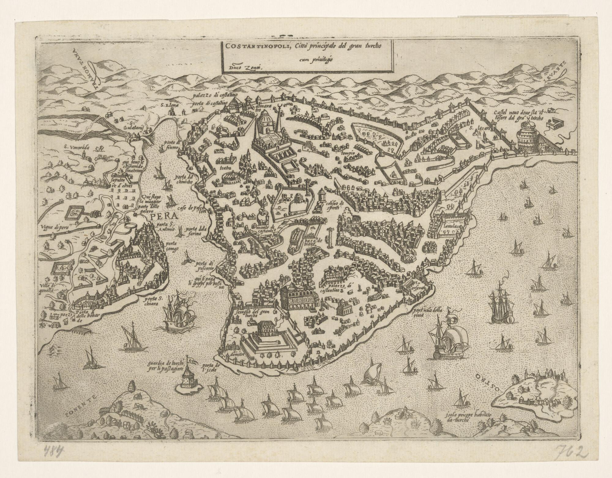 Kaart van de stad Constantinopel in circa 1560 door Domenico Zenoi