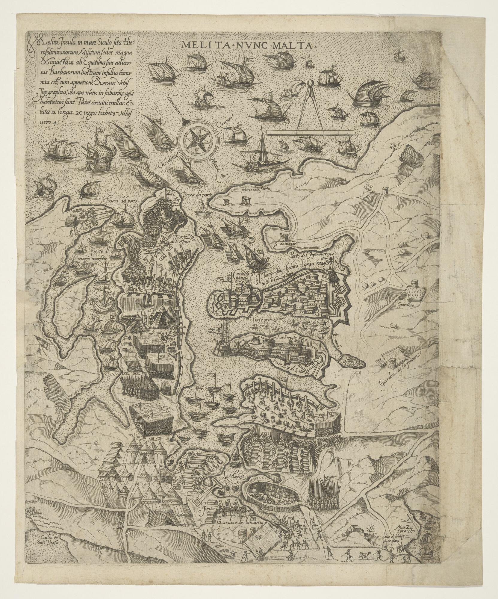 Anonieme kaart van een noordelijk gedeelte van het eiland Malta met onder meer het fort Castello Angelo, circa 1550.