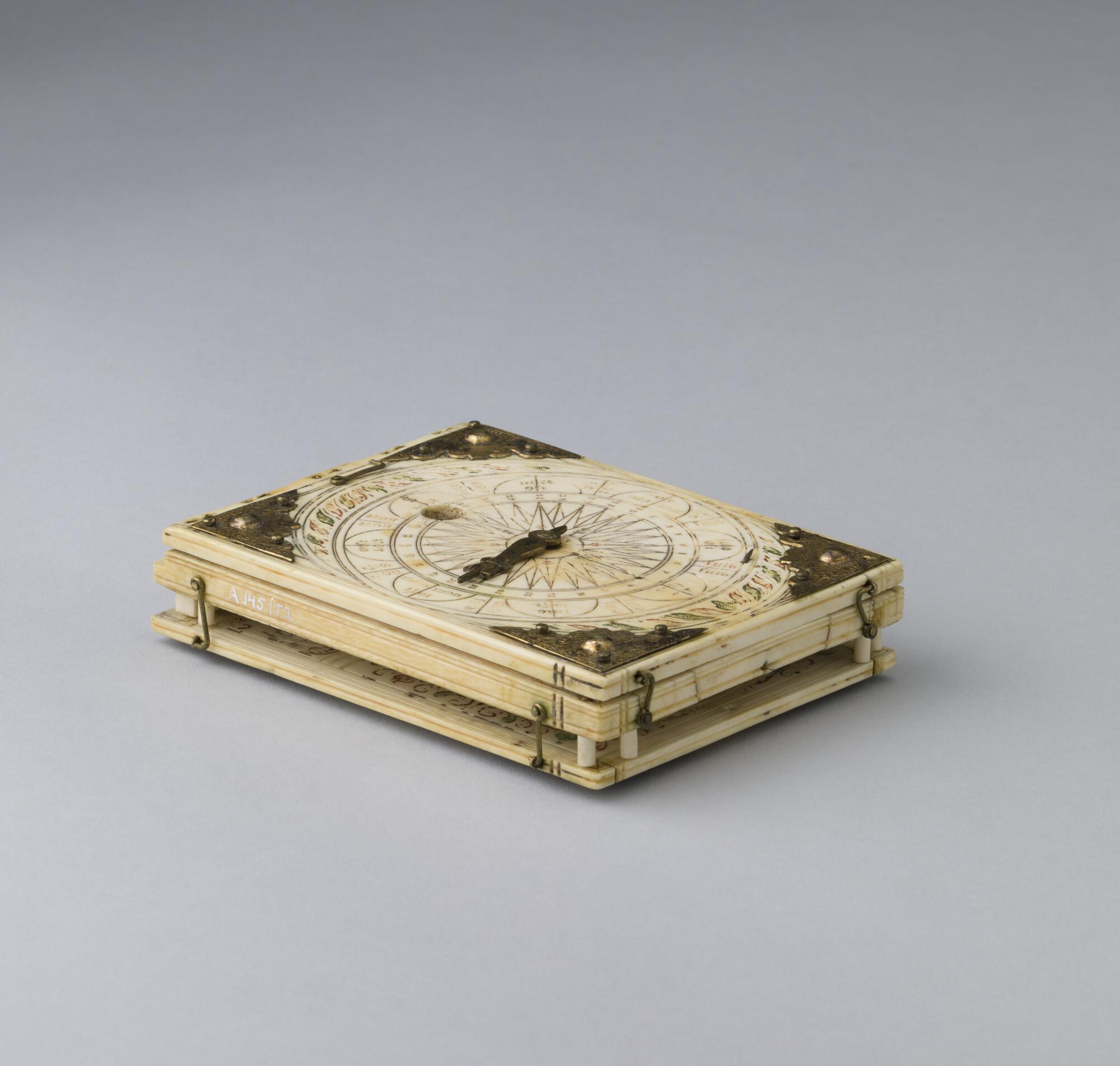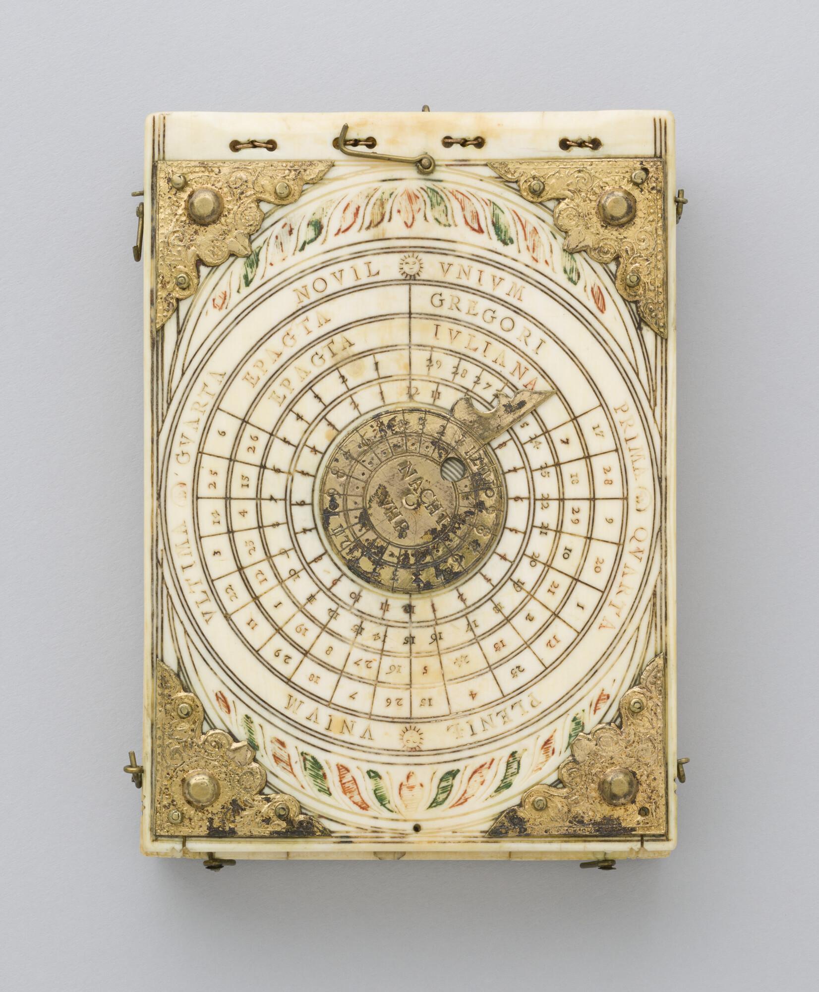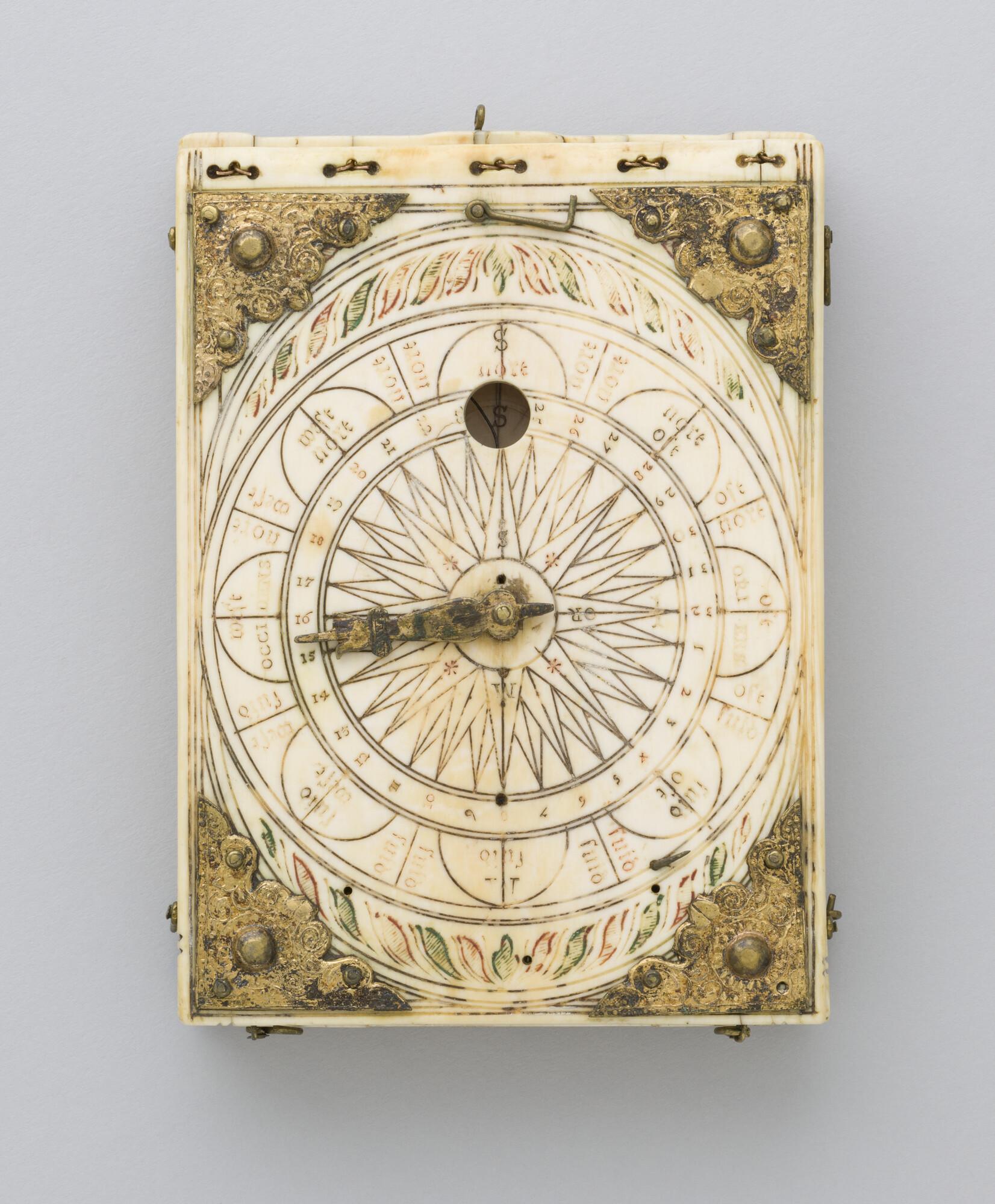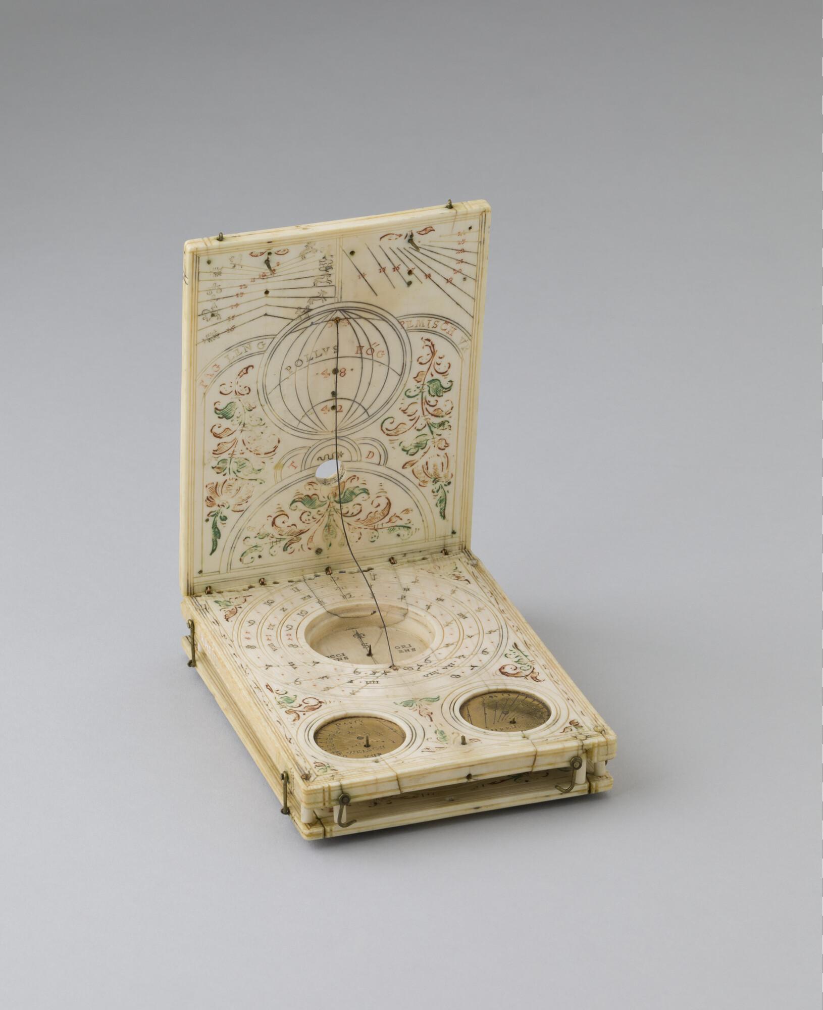 Ivoren zakzonnewijzer door Thomas Tucher, Neurenberg, 1602. Voor 42°, 48° en 52° breedte. Zonnewijzers voor Welsch uhr (45°) en Neurenberger ur (49°), daglengte, joods uur, vergelijking groot, klein & nacht uur met epacta voor Juliaanse en Gregoriaanse tijdsrekeningen.