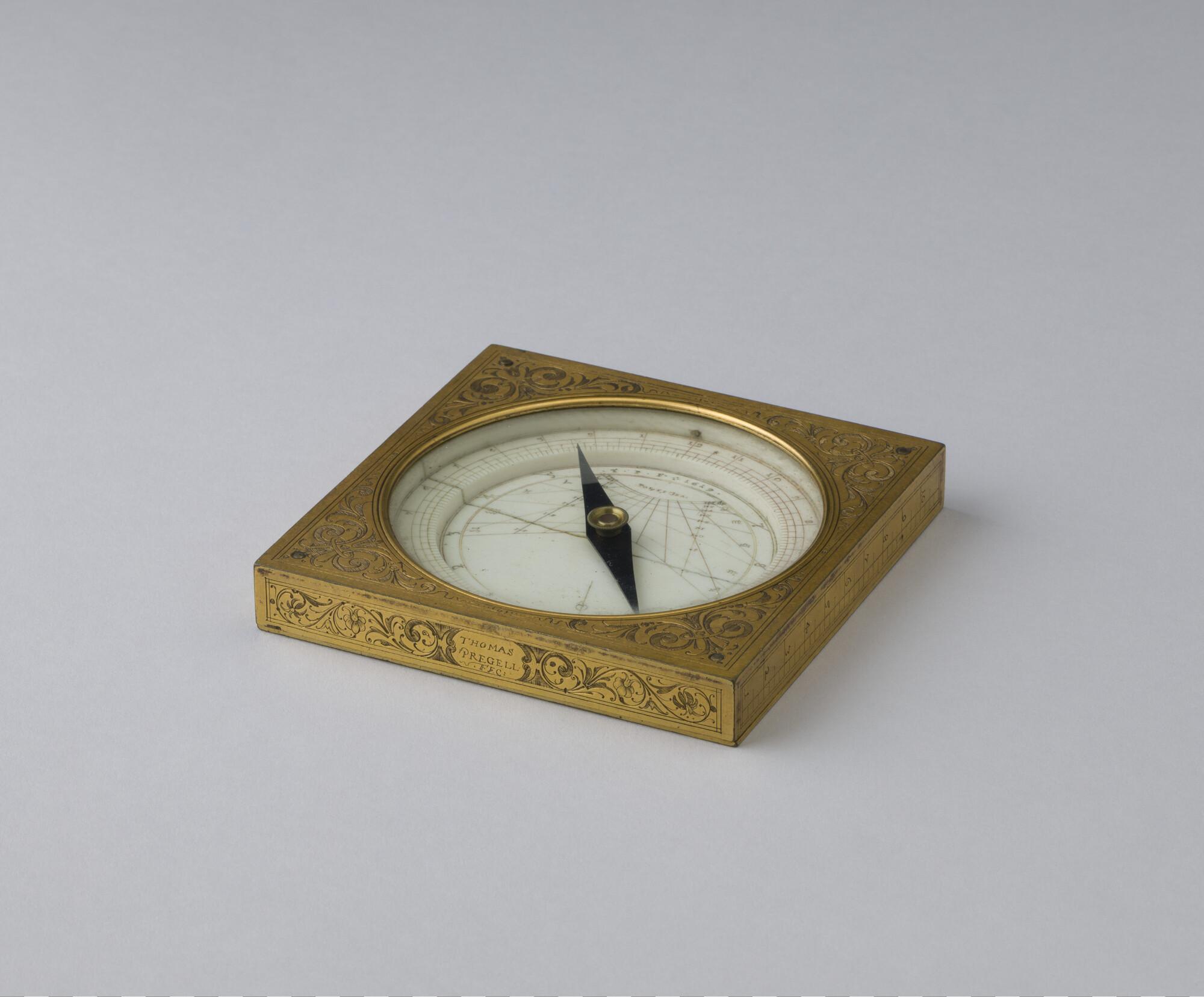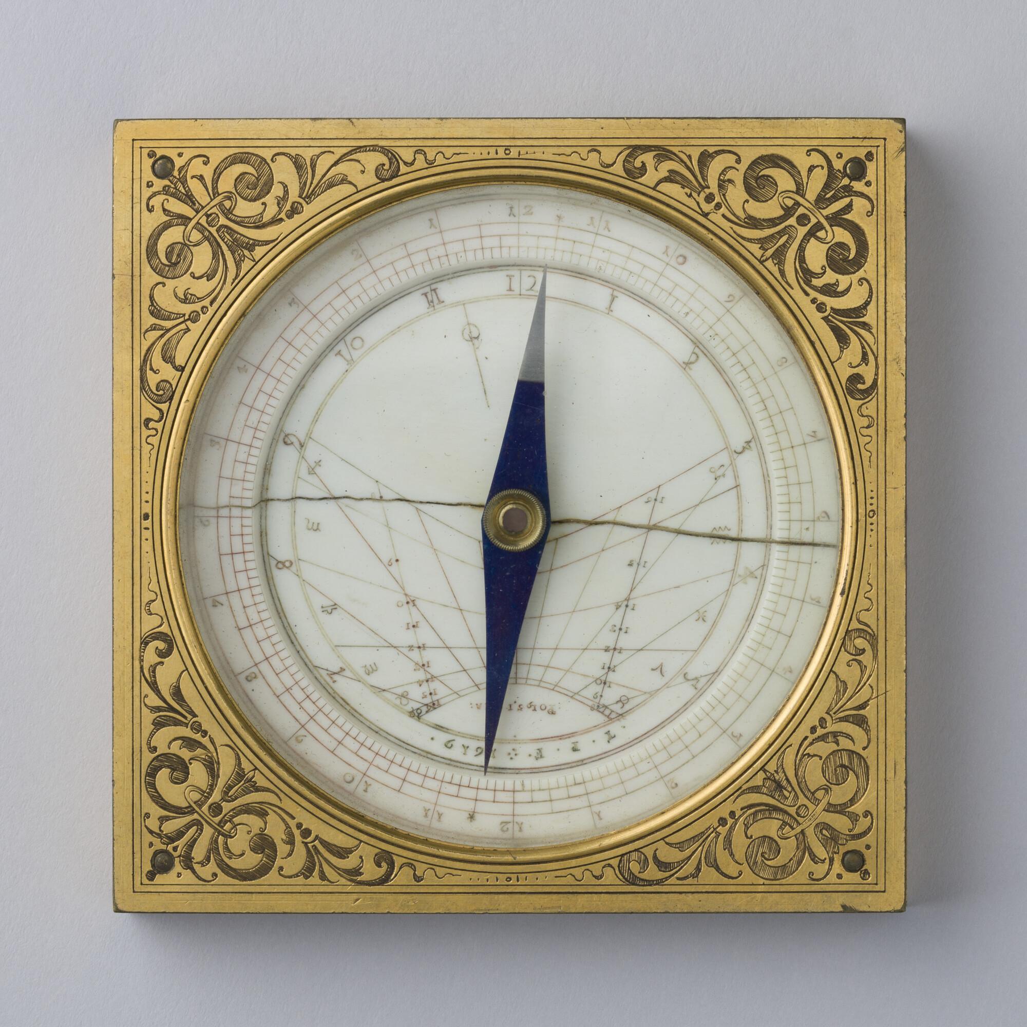 Vergulde zonnewijzer voor 51° breedte door Thomas Pregell, 1619. Op de achterzijde een kwadrant voor hoogtemeting. Het schietlood ontbreekt, het kompas heeft een moderne naald.