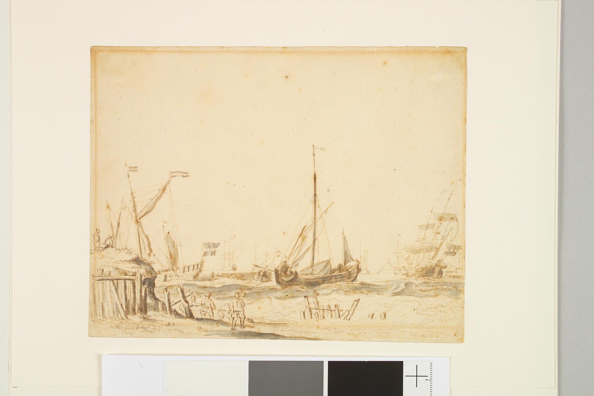 Gezicht op een rede vanaf een oever. In het midden een voor anker gaand vissersvaartuig, links een statenjacht, gedeeltelijk zichtbaar. Op de voorgrond enige figuren.
