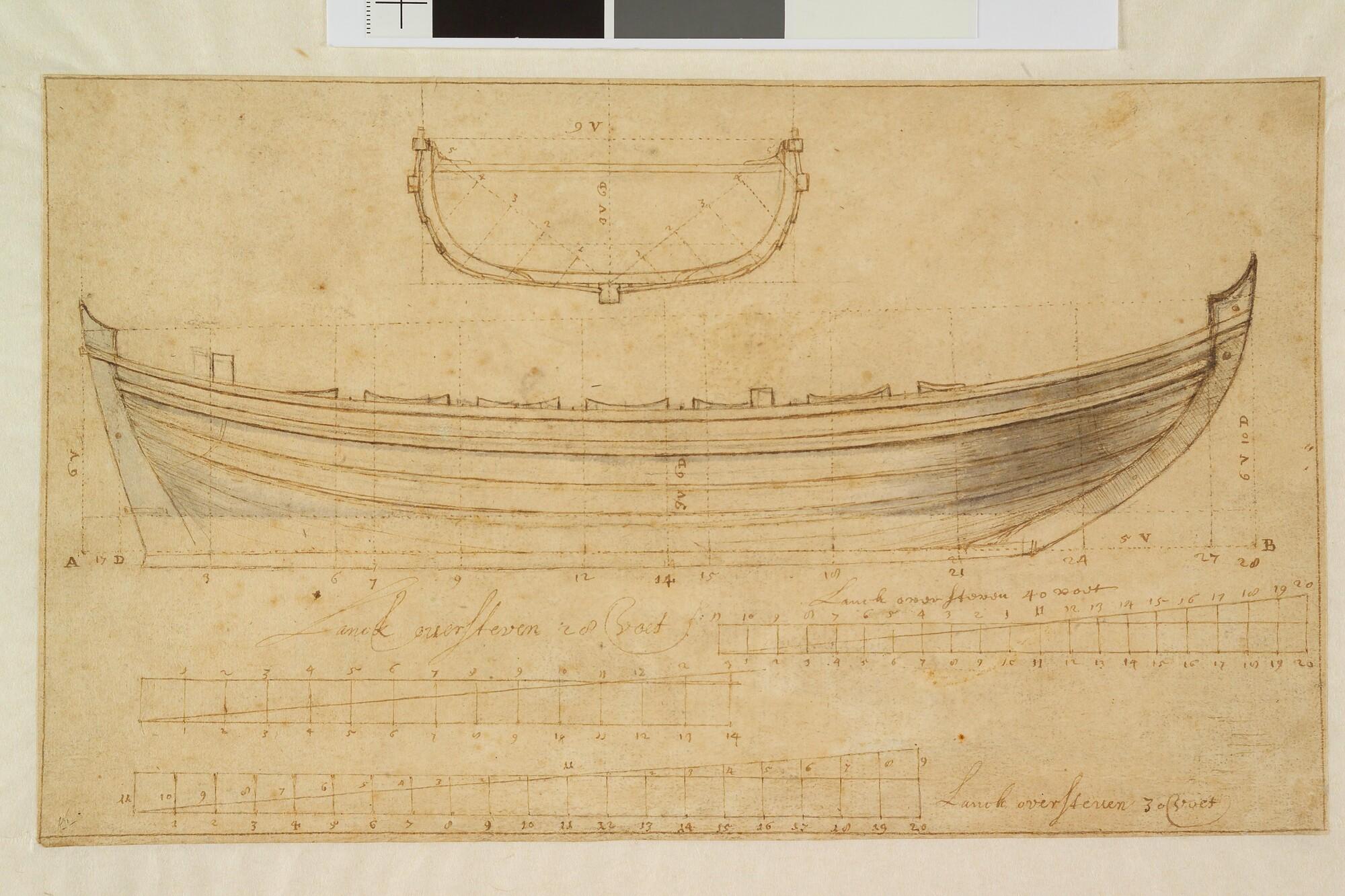 Zijaanzicht van een chaloup 28 voet, 12 riemen.