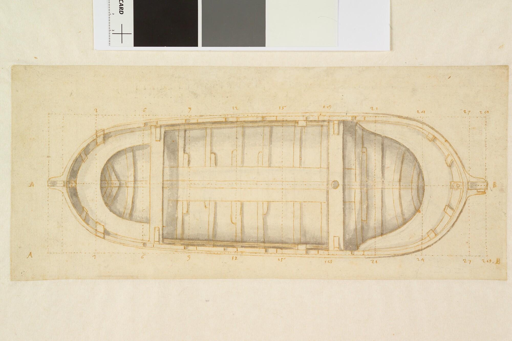 Bovenaanzicht van een chaloup 28 voet, 12 riemen.