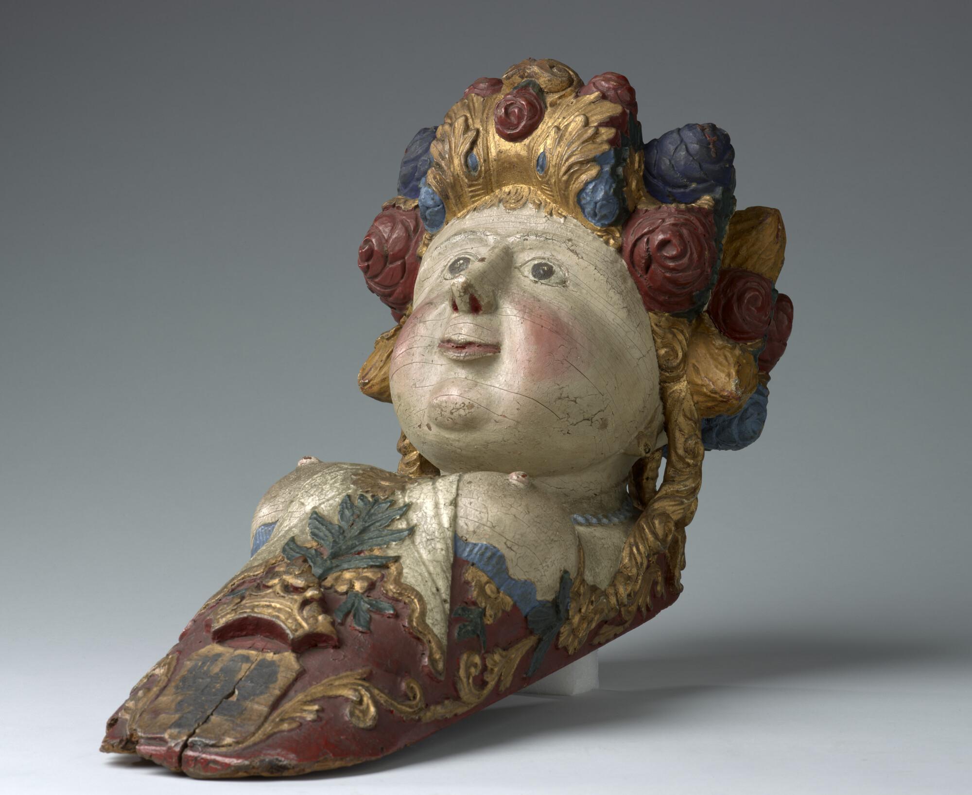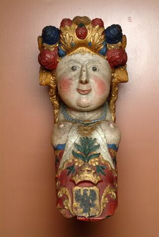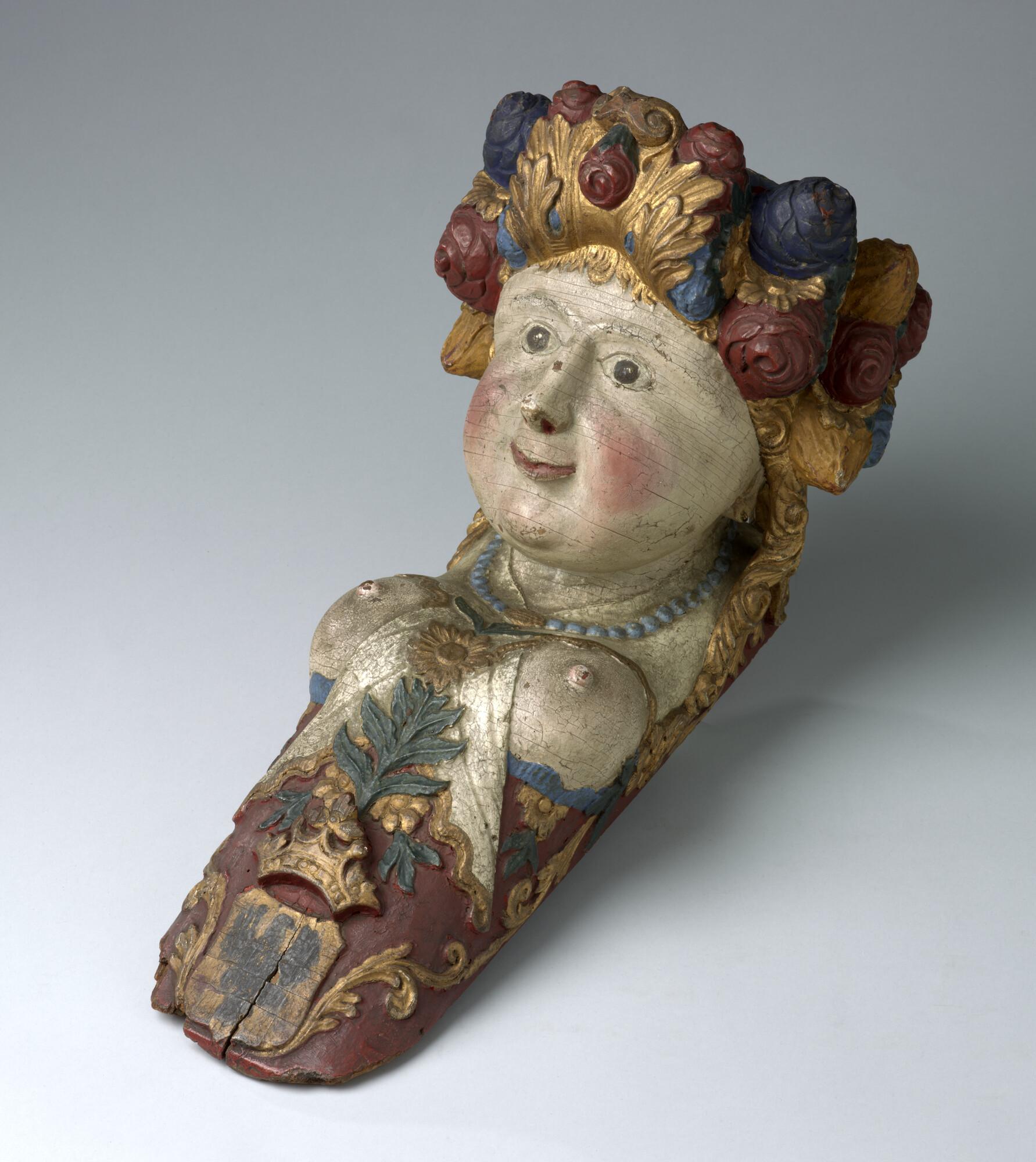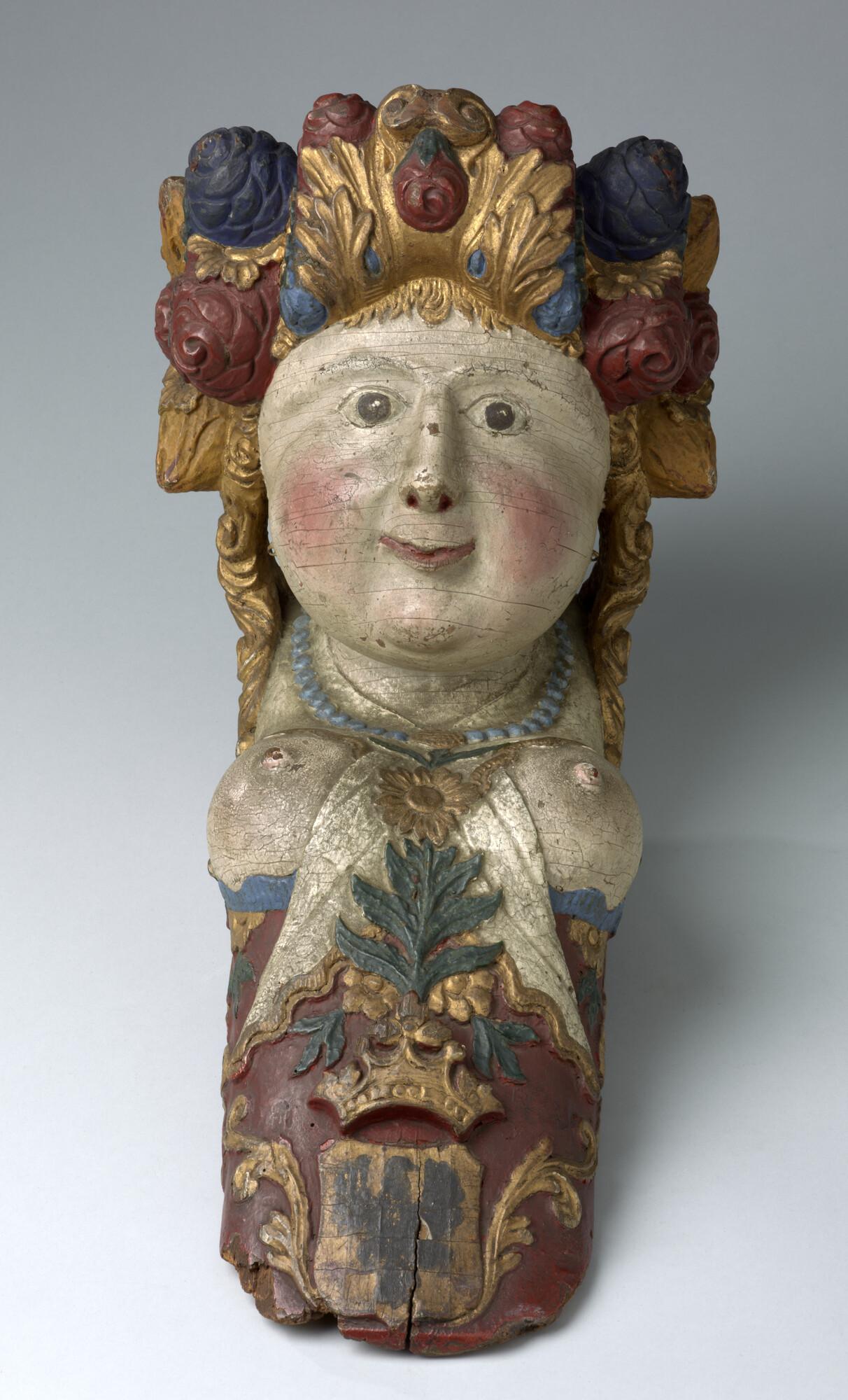 Roerkop in de vorm van een vrouwenhoofd getooid met een bloemenkrans, een z.g. 'Flora'. Met wapen van Deventer.