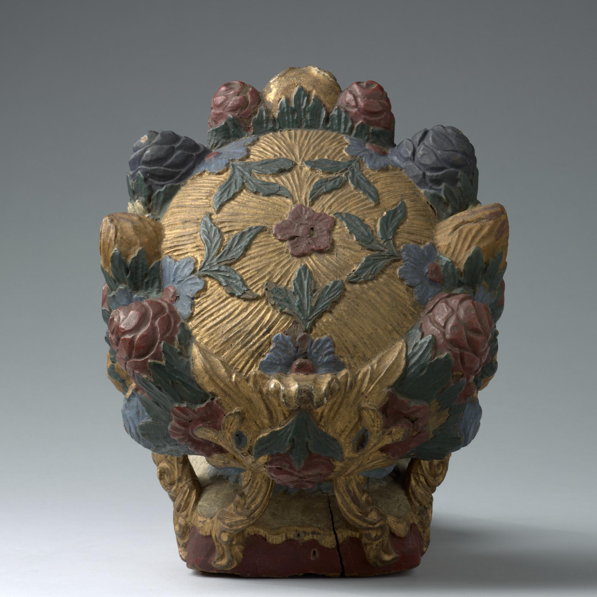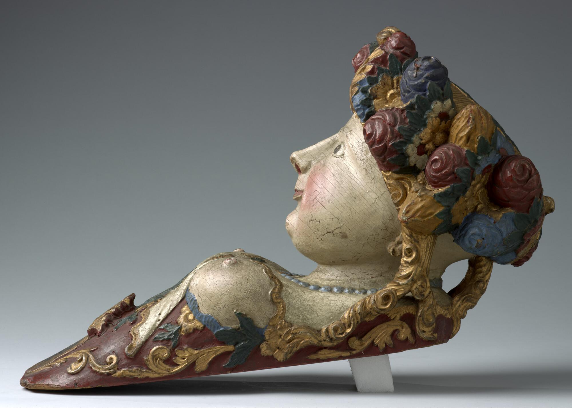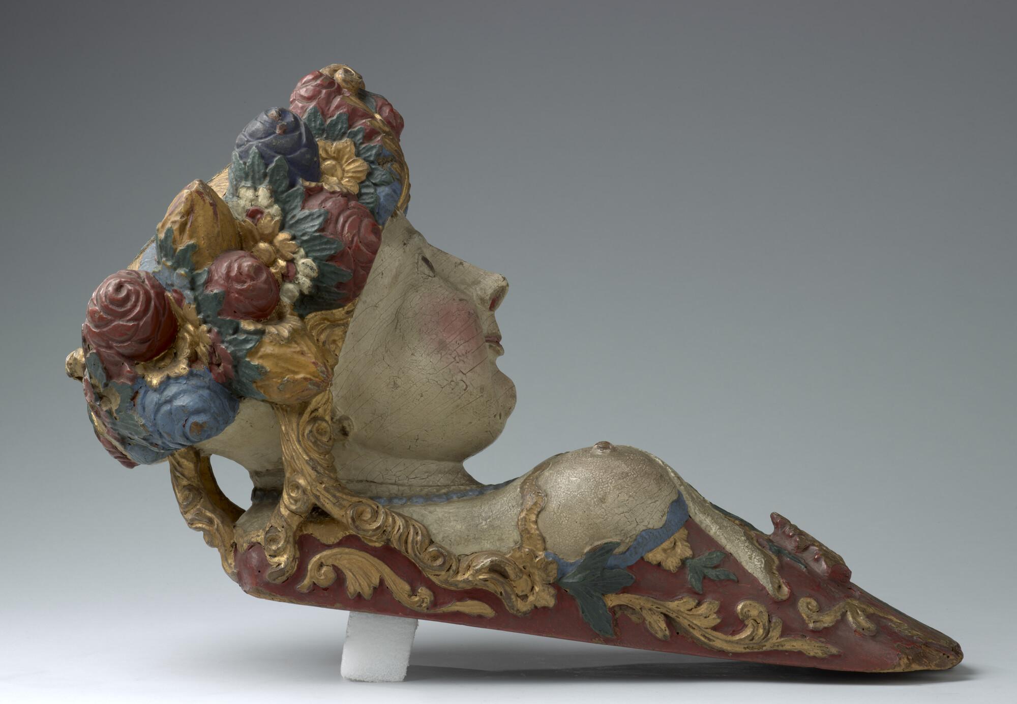 Roerkop in de vorm van een vrouwenhoofd getooid met een bloemenkrans, een z.g. 'Flora'. Met wapen van Deventer.