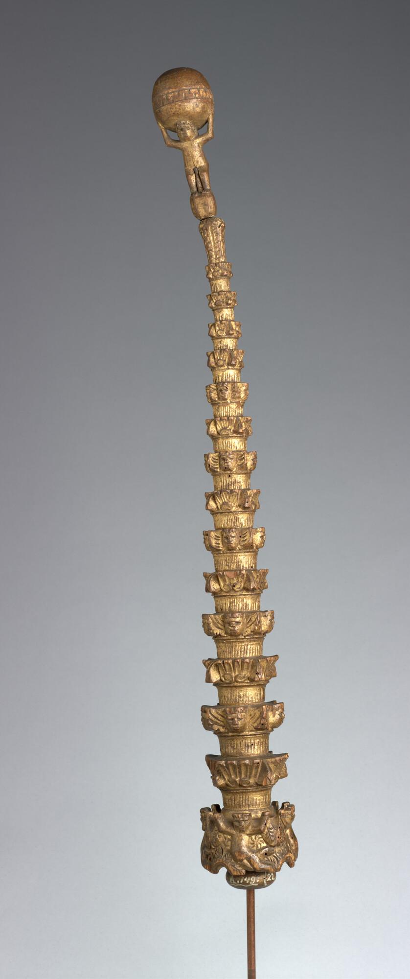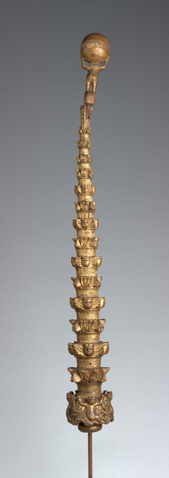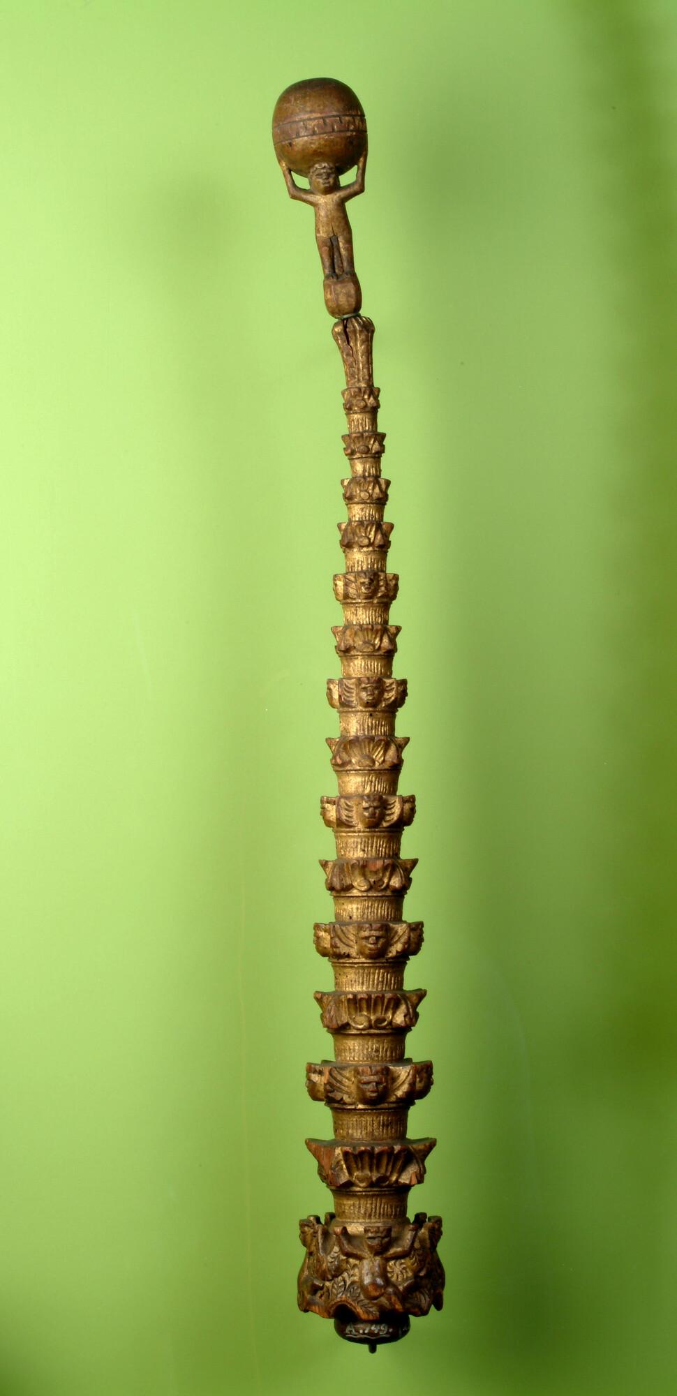 Mastwortel met vijftien geledingen waarvan de ringen zijn versierd met gestileerd uitgesneden decoraties. Op de top een uitgesneden, licht gebogen menselijk figuurtje (Atlas), staande op een bol. Boven zijn hoofd houdt hij met beide handen een grotere (aard)bol vast. In het midden van de bol is een versierde band uitgesneden.