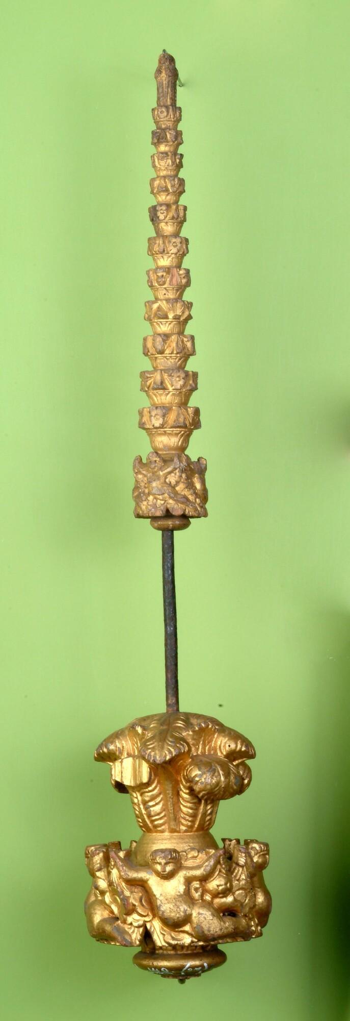 Mastwortel met veertien geledingen waarvan de ringen zijn versierd met gestileerd uitgesneden decoraties. Met op de top een uitgesneden acanthusblad.