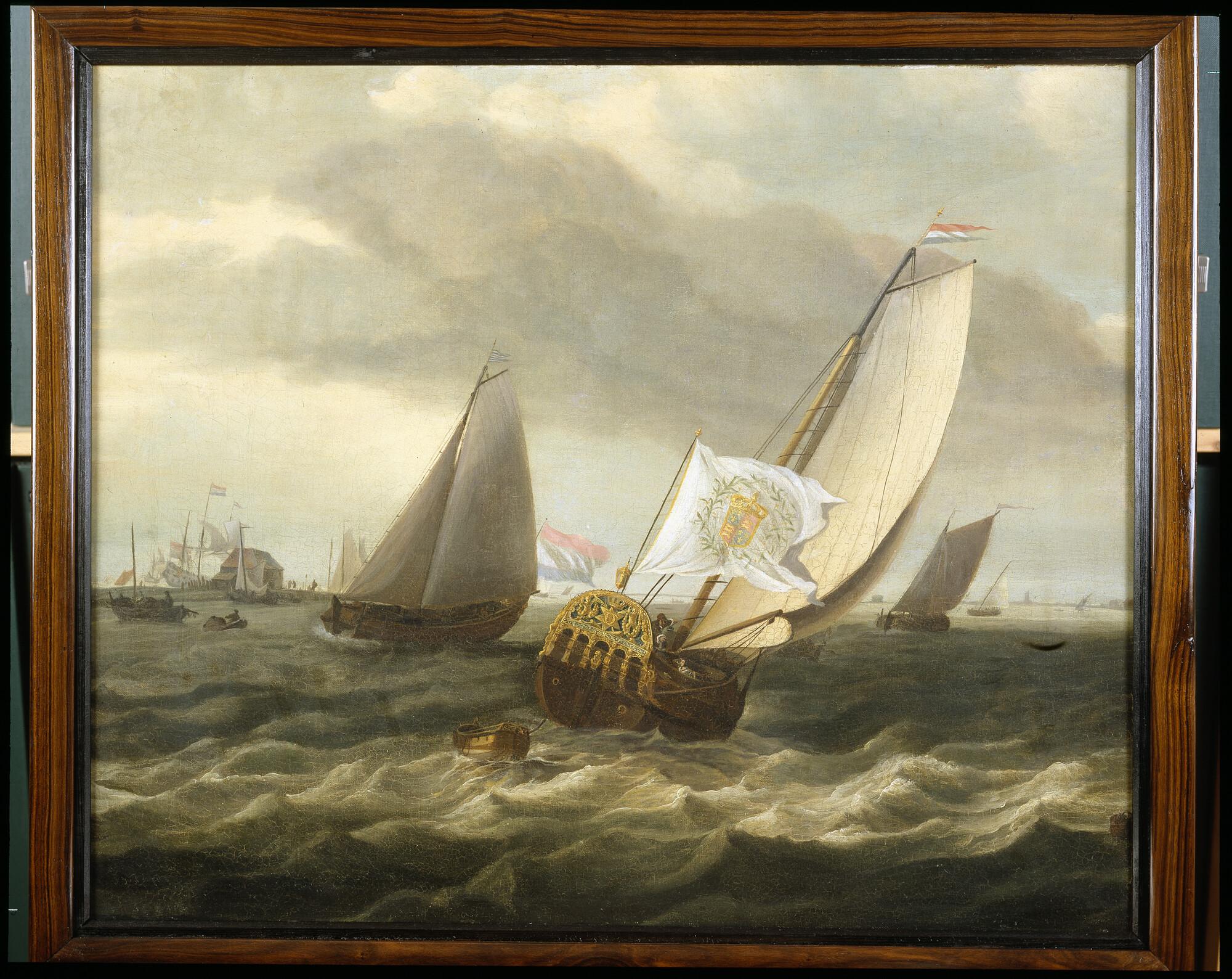 Het bezaanjacht Bezan van de Engelse koning Karel II zeilend op het IJ, 1661