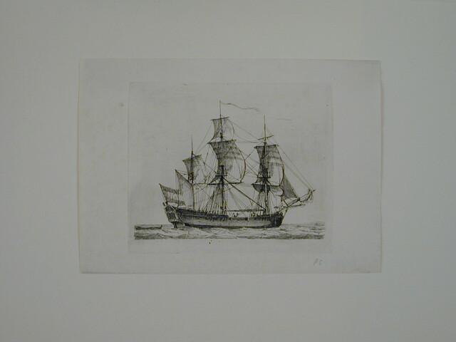 Prent van een fregatschip, voor de wind zeilend. Uit de suite "Verscheide soorten van Hollandse vaartuigen", 3de katern.
