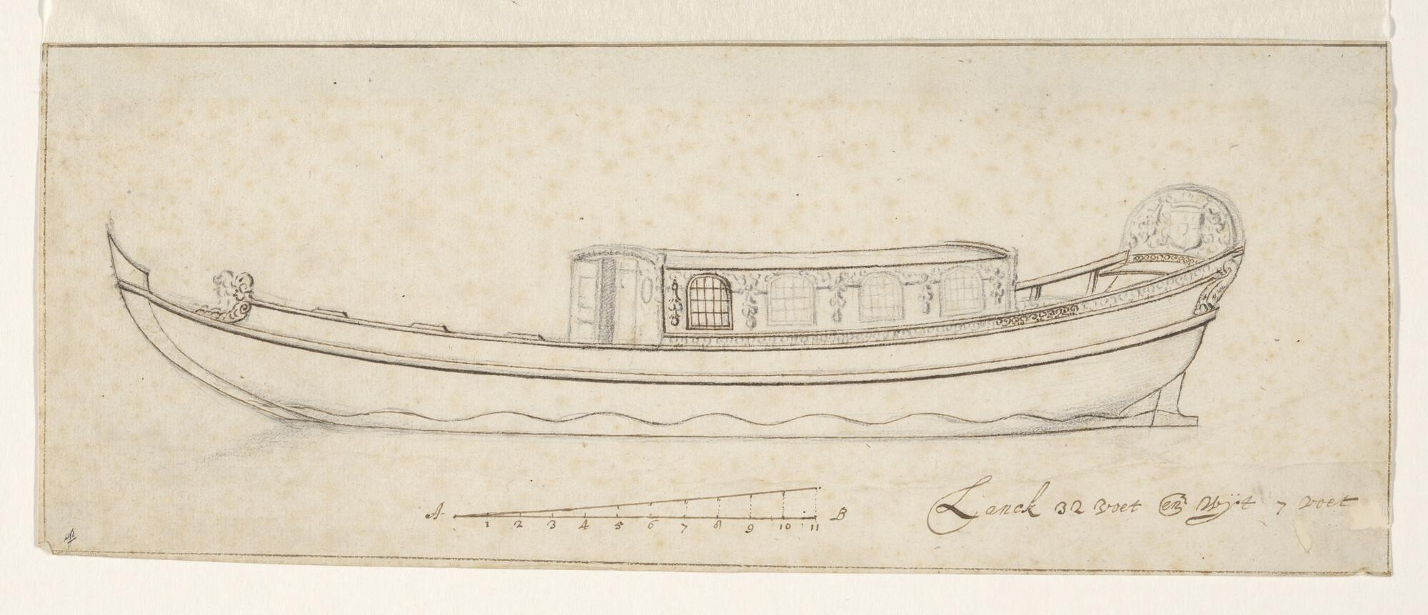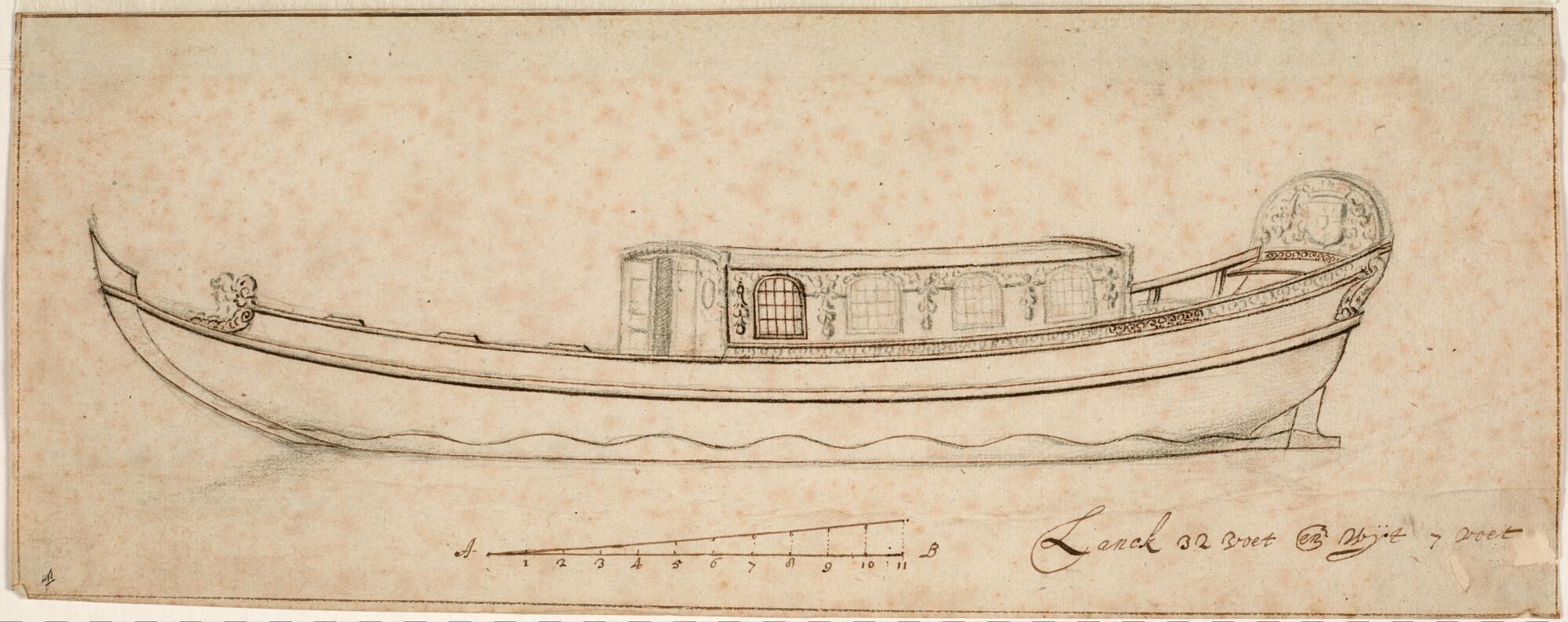 Zijaanzicht van een roeijacht met kajuit. Lengte 32 voet.