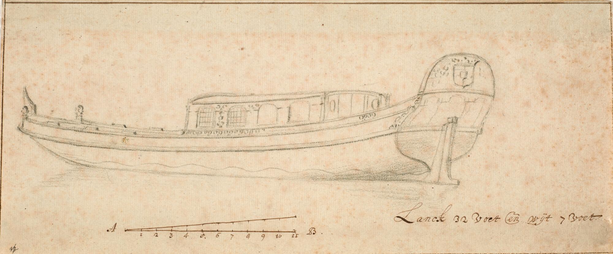 Een roeijacht met kajuit, schuin van achteren gezien. Lengte 32 voet.