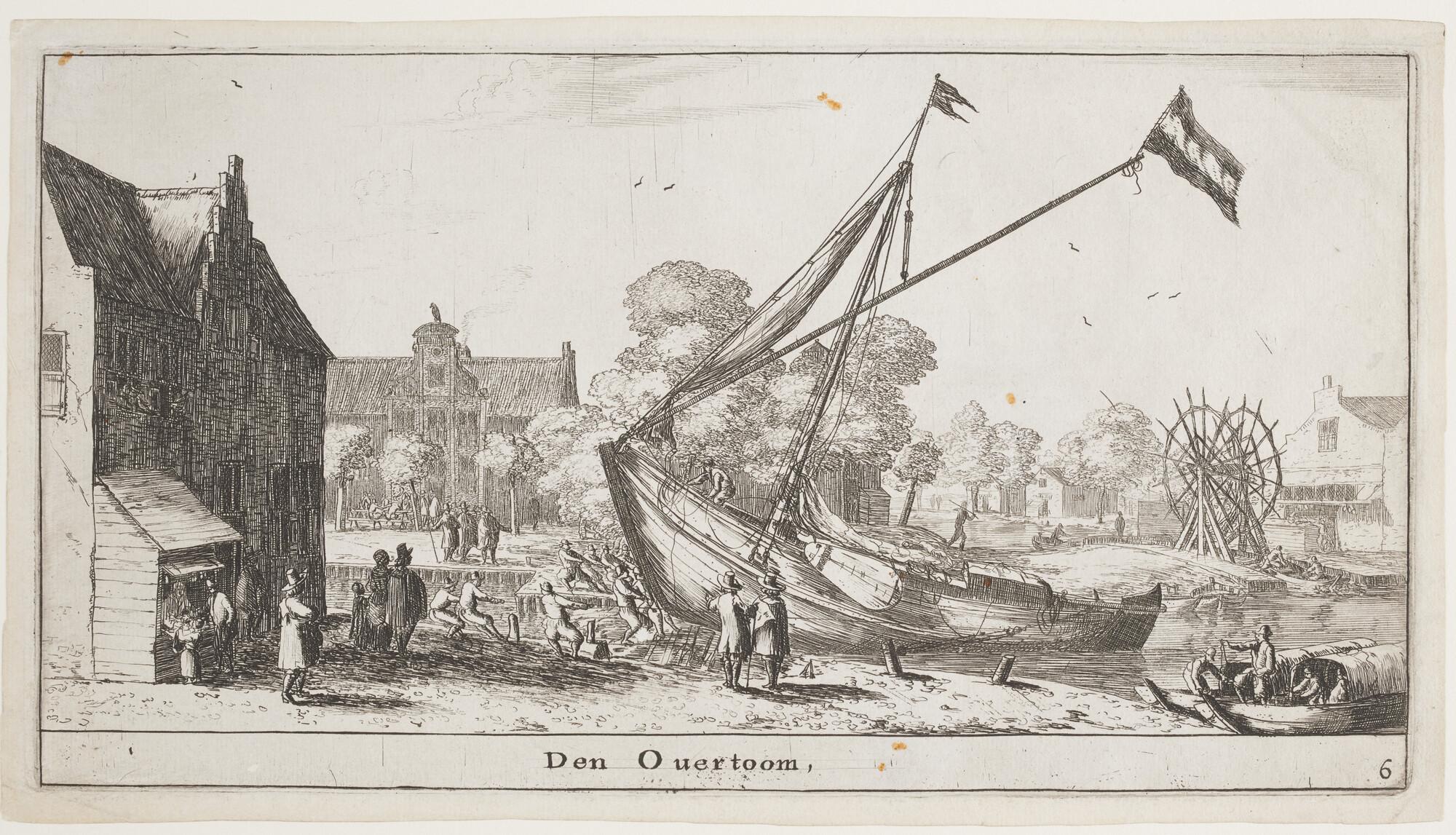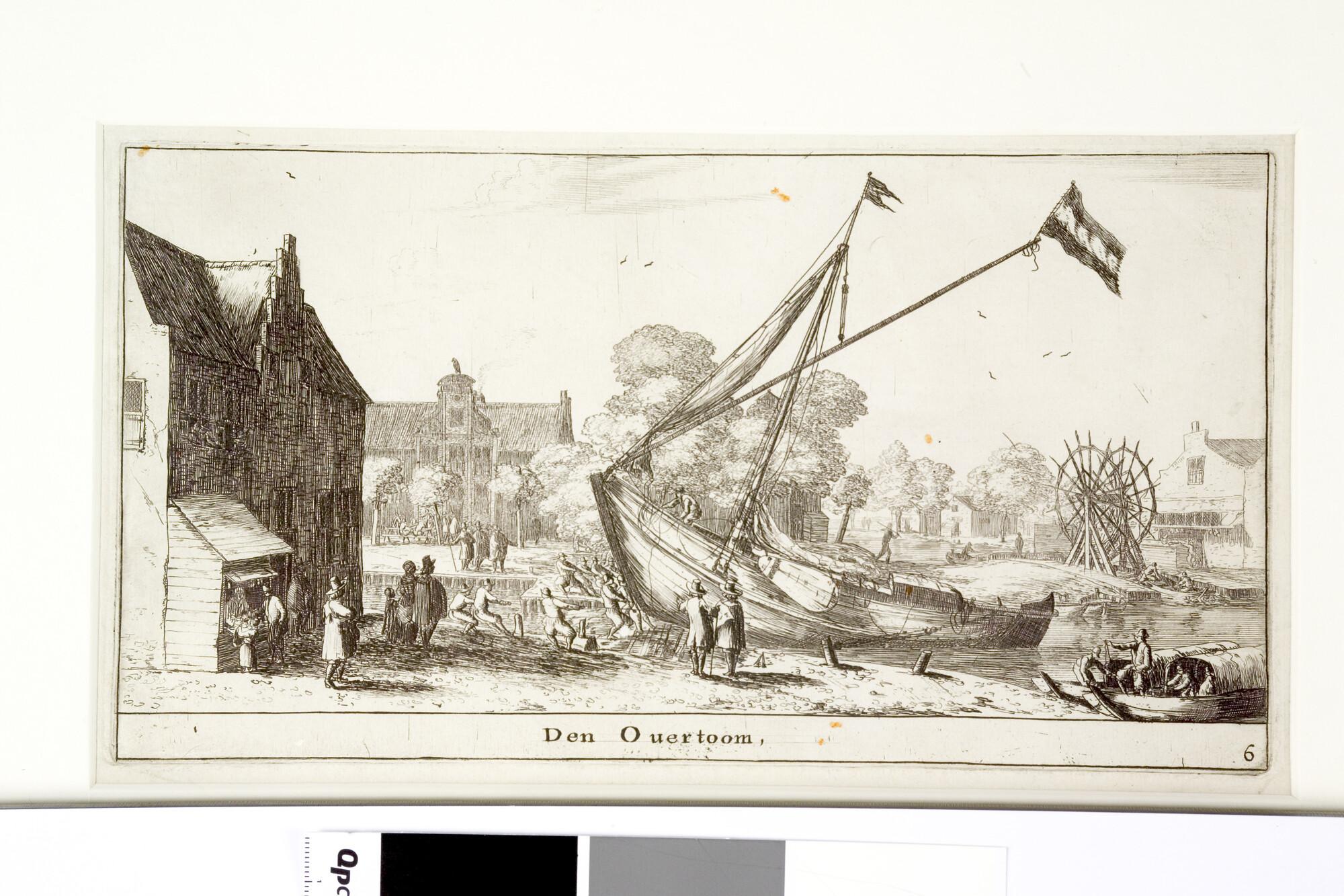 Prent van de Overtoom waarop te zien is hoe een schip over een overtoom of overhaal wordt getrokken, van de Kostverlorenwetering naar de Schinkel. Op de achtergrond is de kleine overtoom naar de Slotervaart te zien. Derde serie, nummer 6.