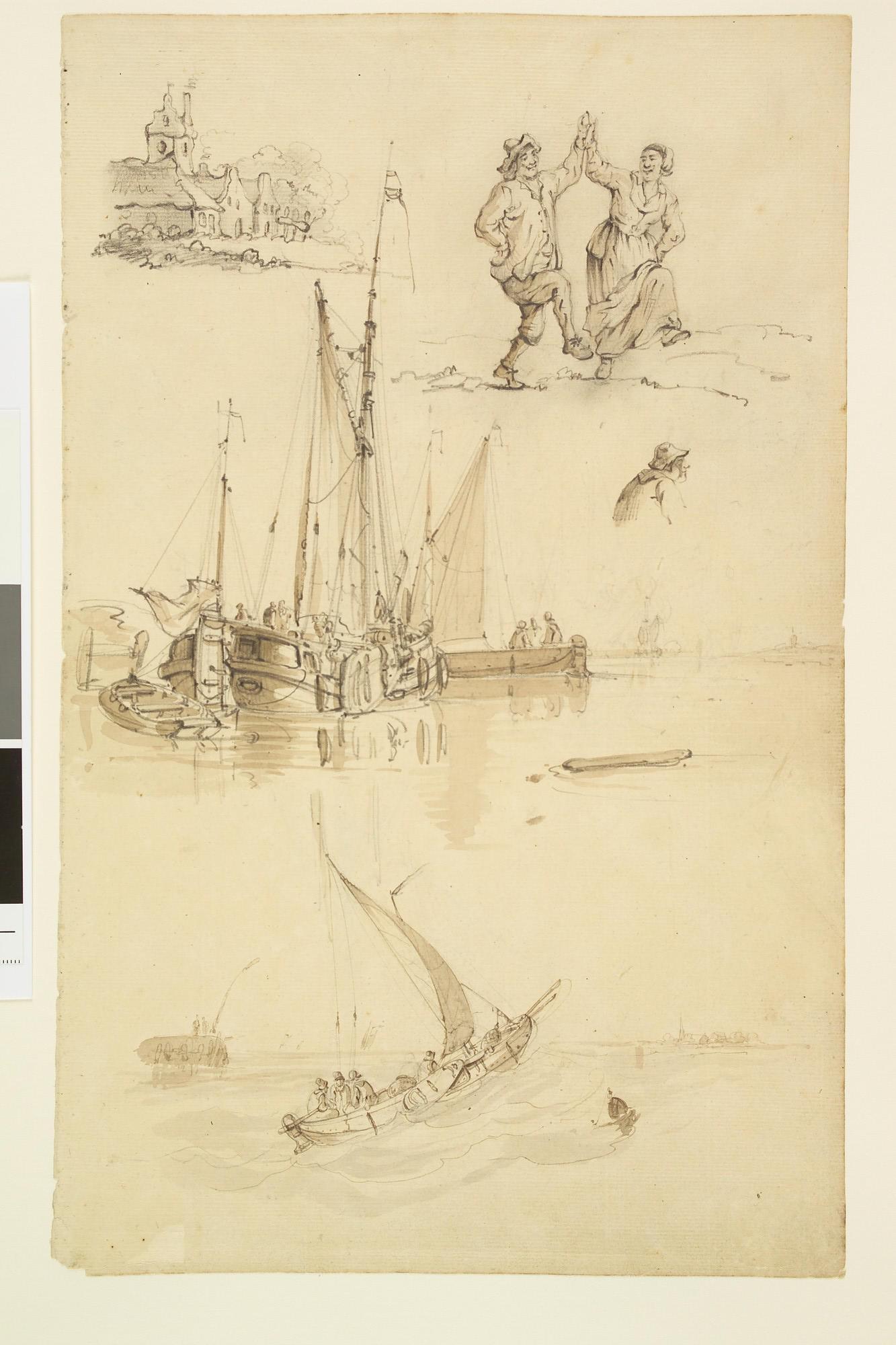 Schetsblad met diverse voorstellingen: een dorpsgezicht, een dansend boerenpaar, stilliggende binnenschepen, studie van een man van opzij, een binnenschip op woelig water. Verso: een gaffelschip.