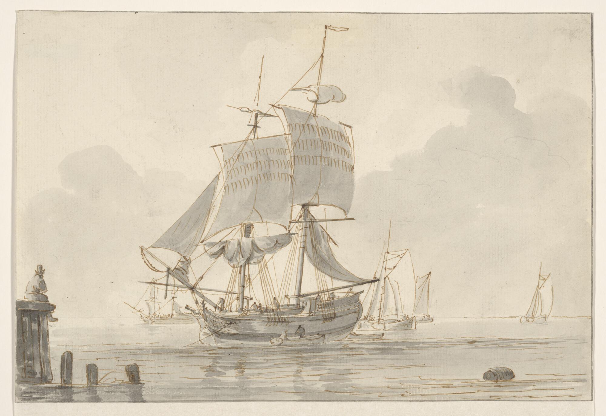 Een brikschip voor anker.