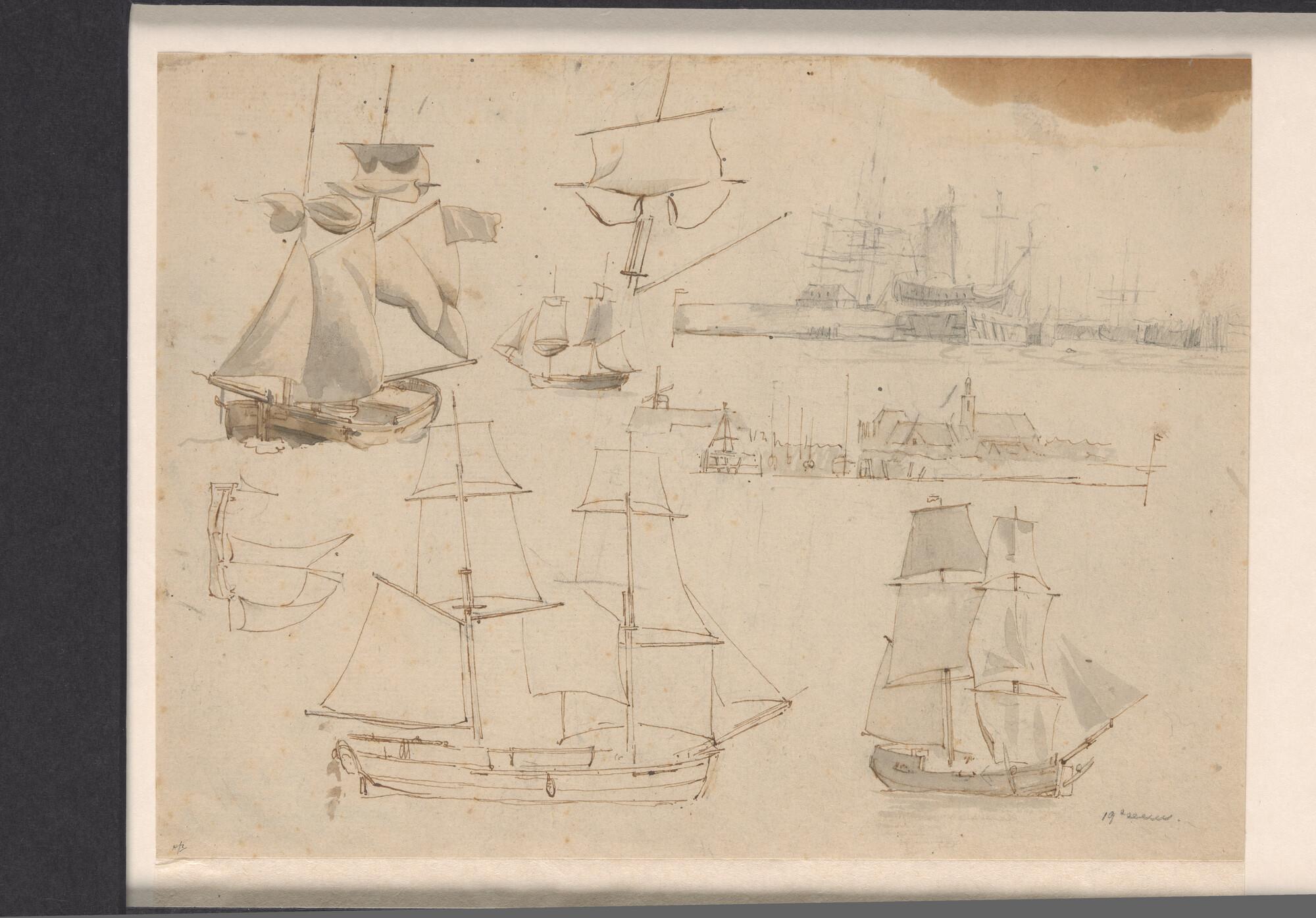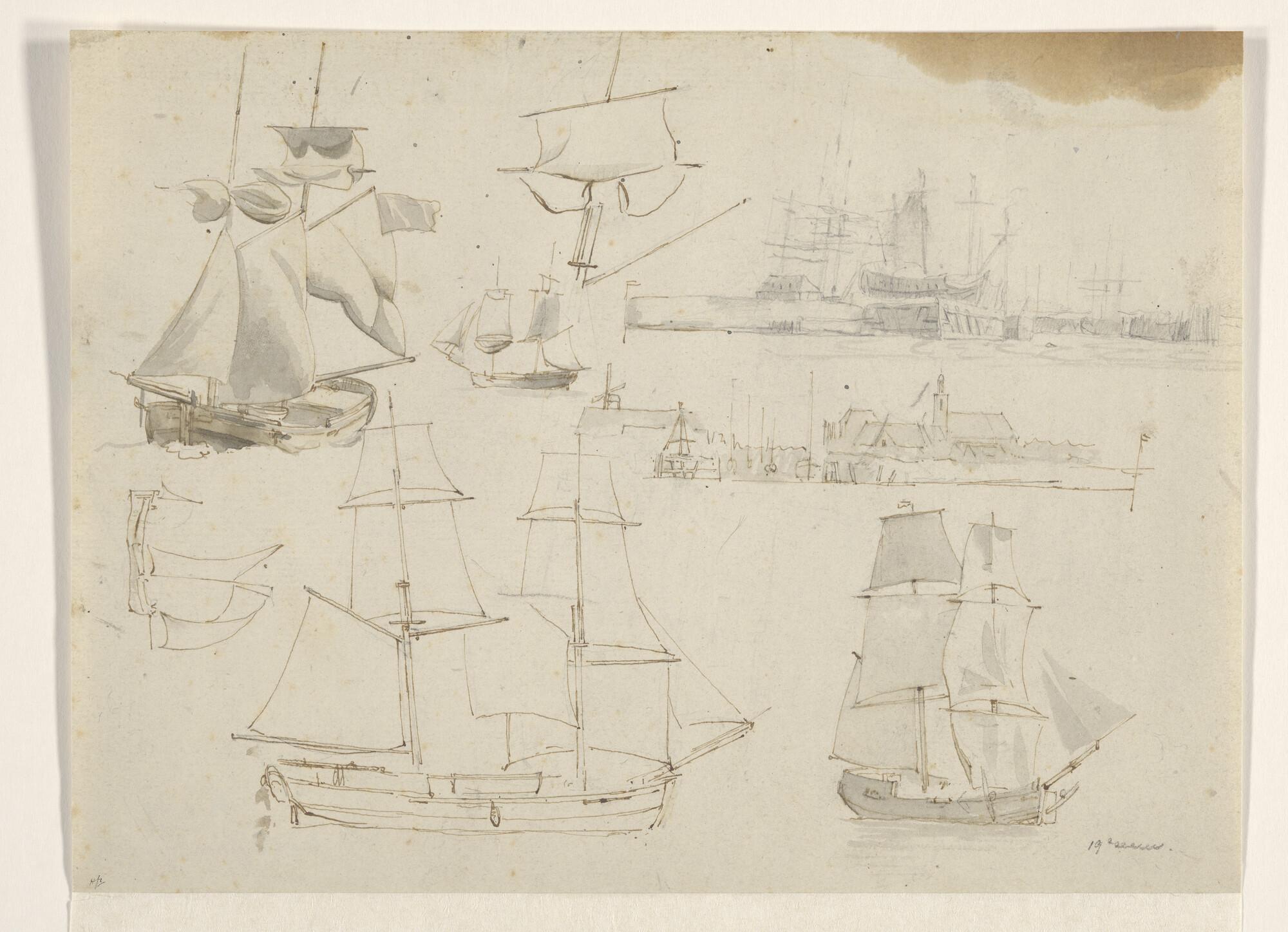 Studieblad met vier brikschepen en twee studies van de haven van Hellevoetsluis.