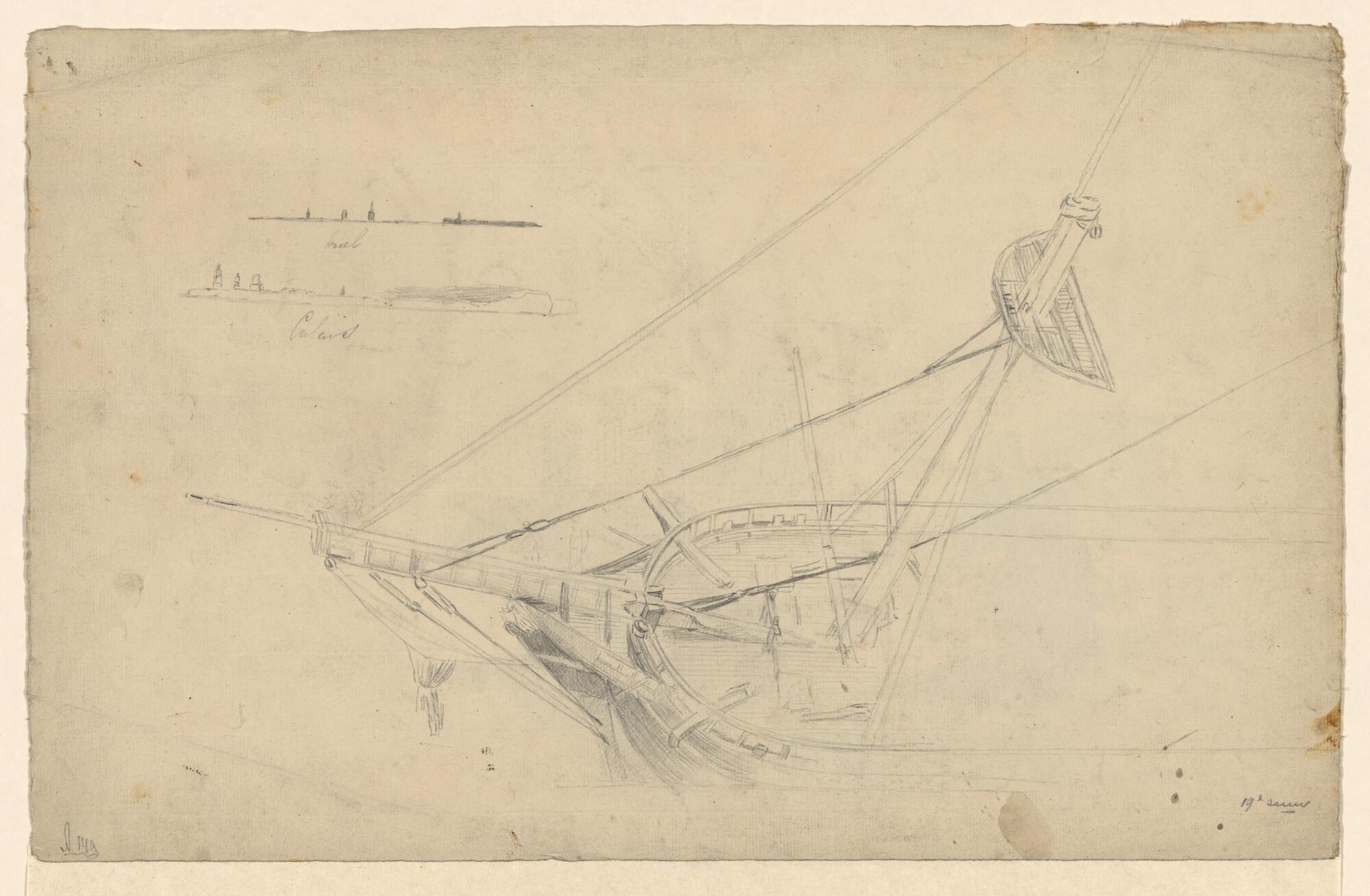 Schetsblad met het voorschip van een driemast zeilend koopvaardijschip, van boven gezien; linksboven landverkenningen van Den Briel en Calais; verso: diverse schetsen van schepen.