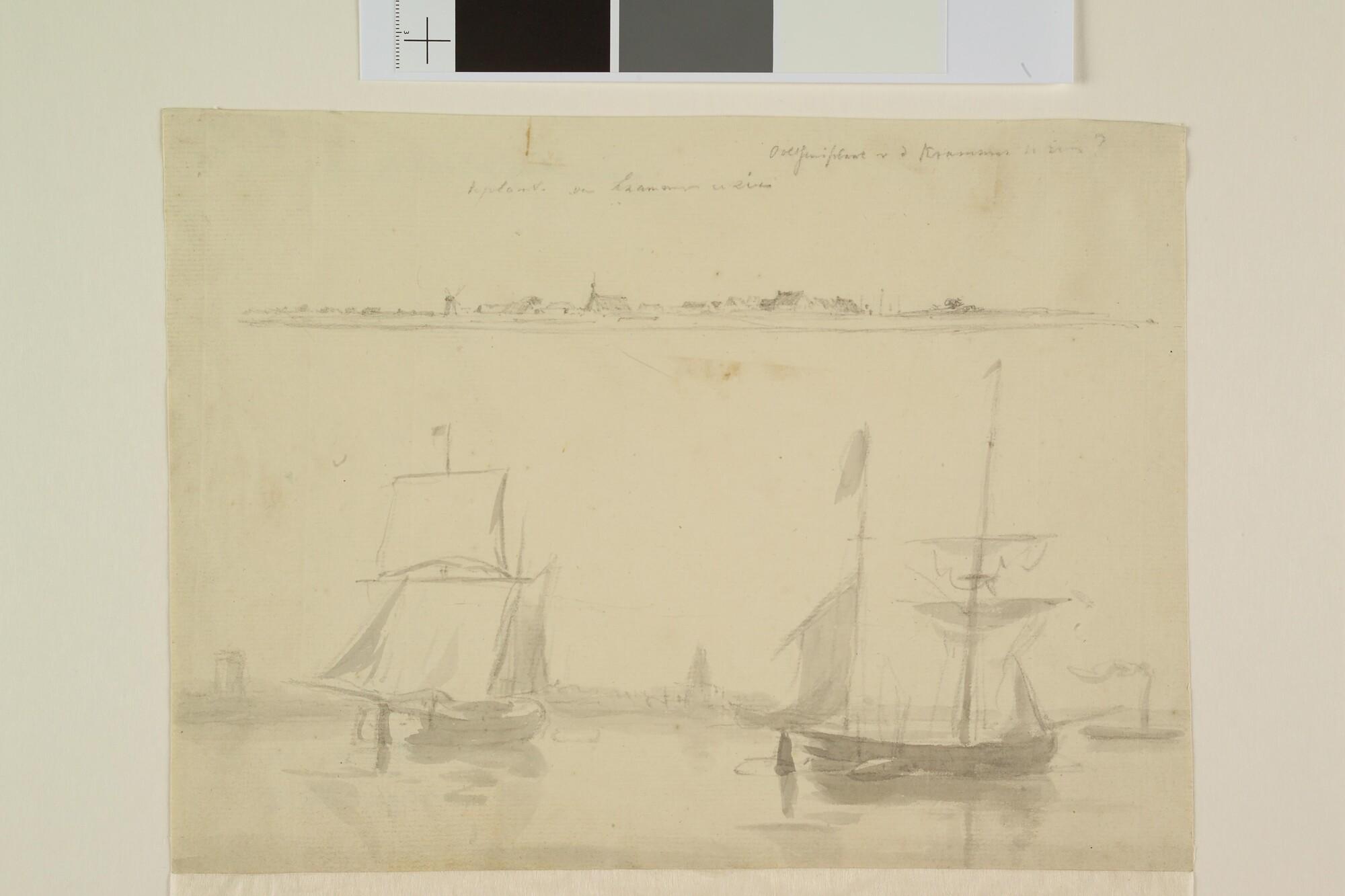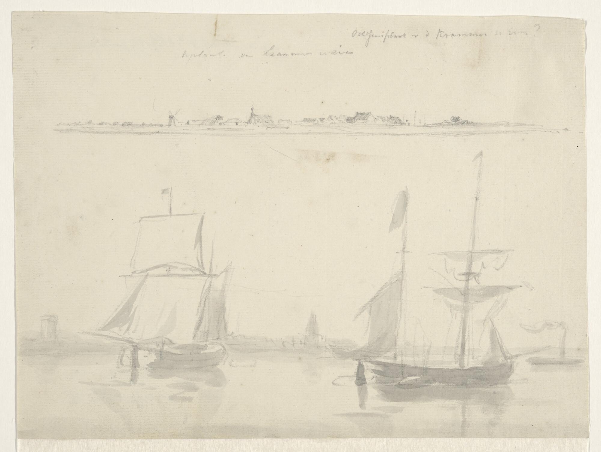 Twee anderhalfmast-koffen op een rede; er boven een landverkenning van Ooltgensplaat [?].