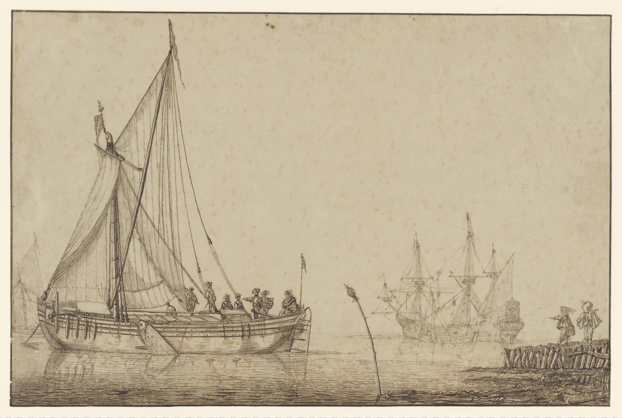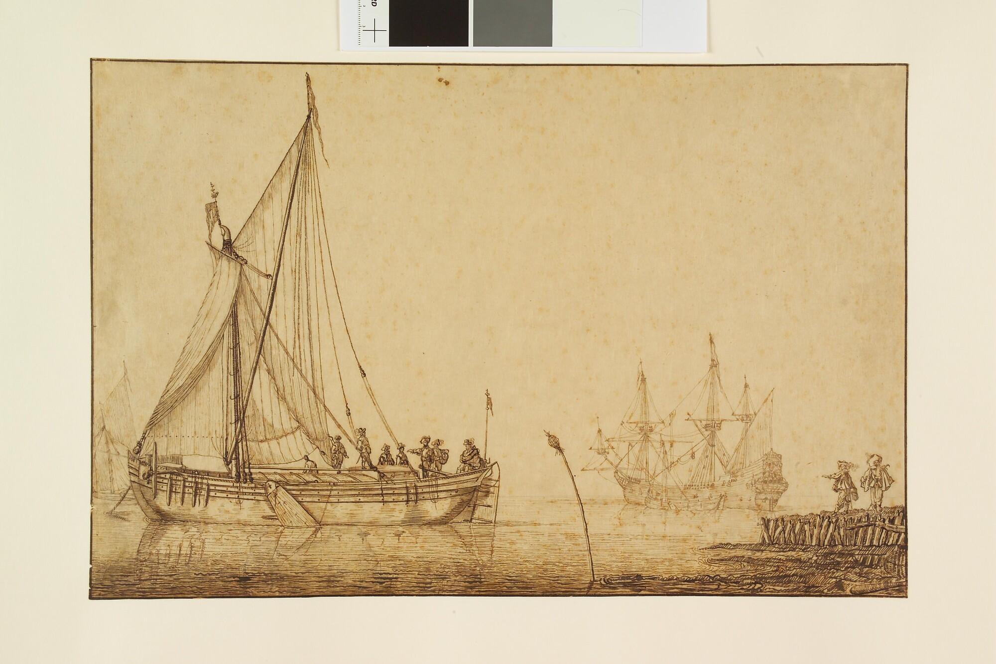 Scheepvaart op een rede met links een beurtschip met passagiers en rechts een oorlogsschip.