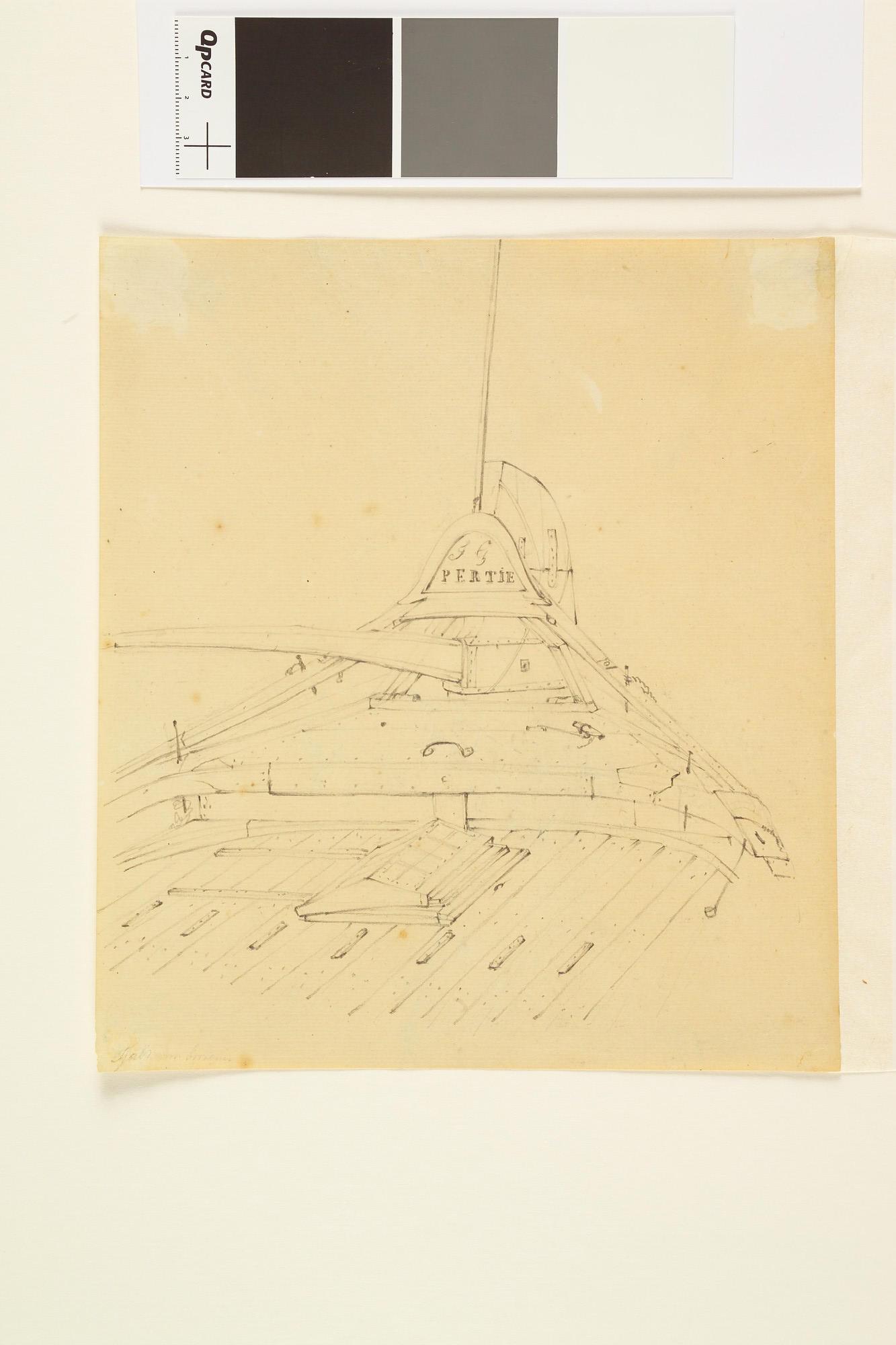 Het achterschip van de tjalk "Pertie". [Verso: een poon en een smak door A. van Beest.].