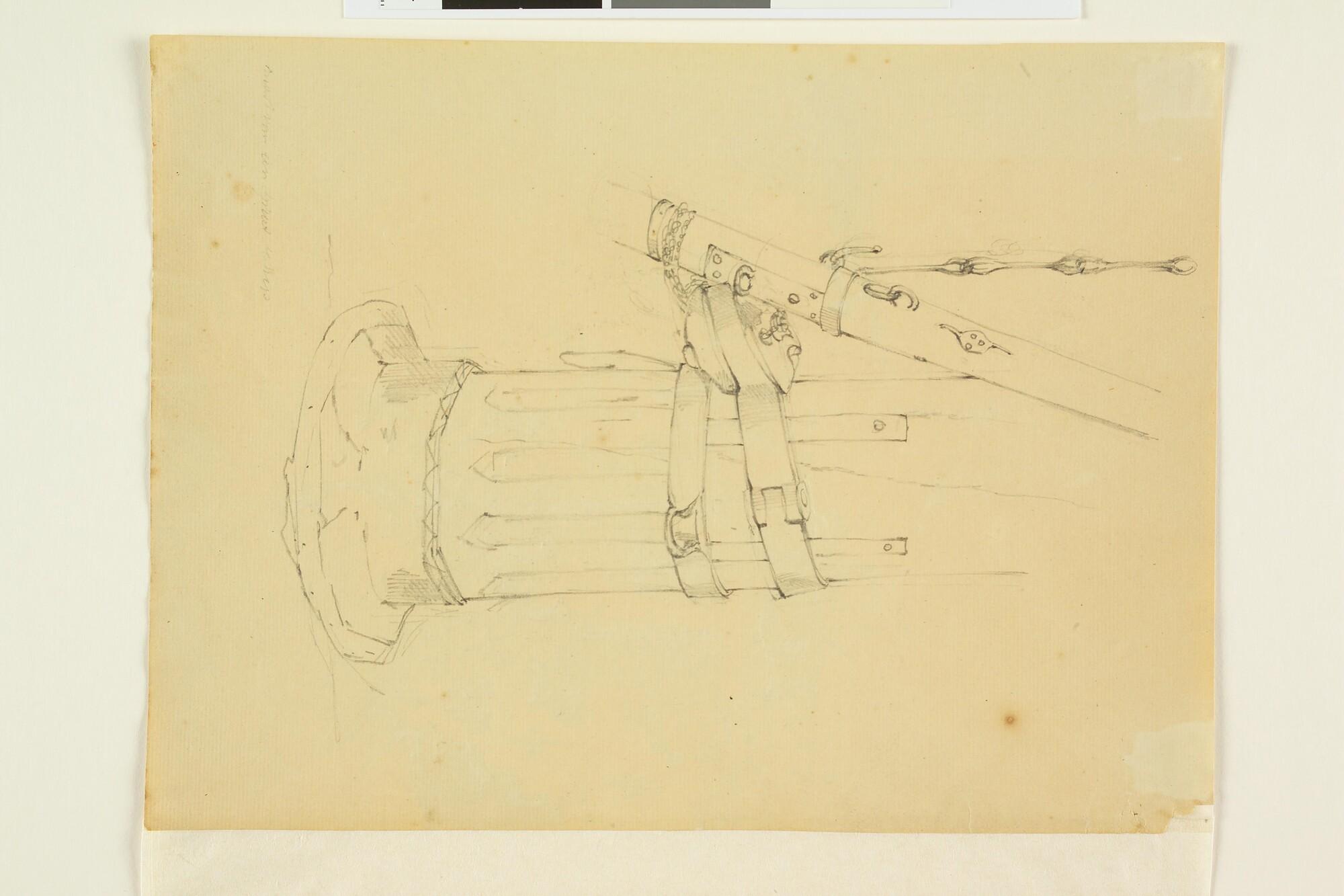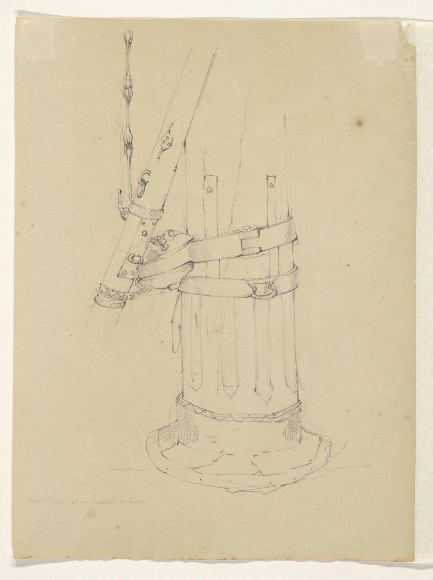 Mast van een sprietschip. Het onderstuk van de mast met bevestiging van de spriet. [Verso: schepen afgemeerd nabij een vestingtoren.].