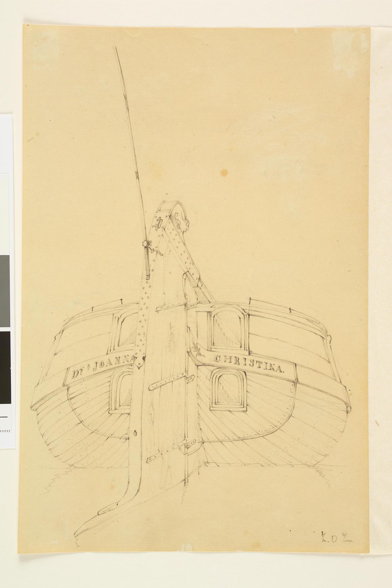 De paviljoenpoon "De Vrouw Johanna Christina", gezien van achter. [Verso: een hond, twee binnenschepen, een roeiboot en een schipper aan een helmstok].