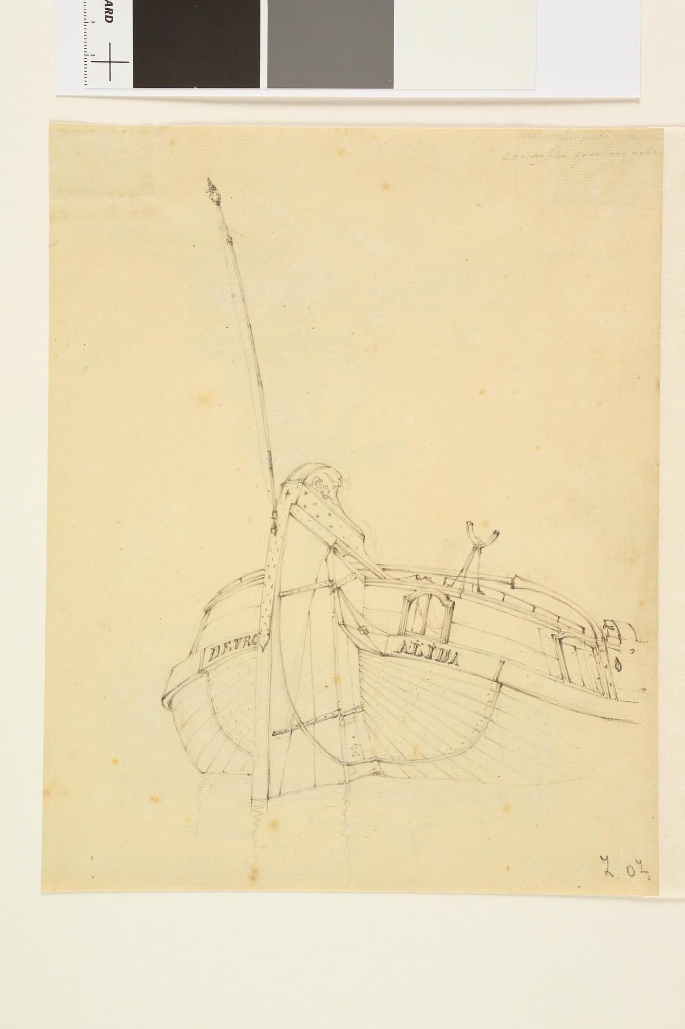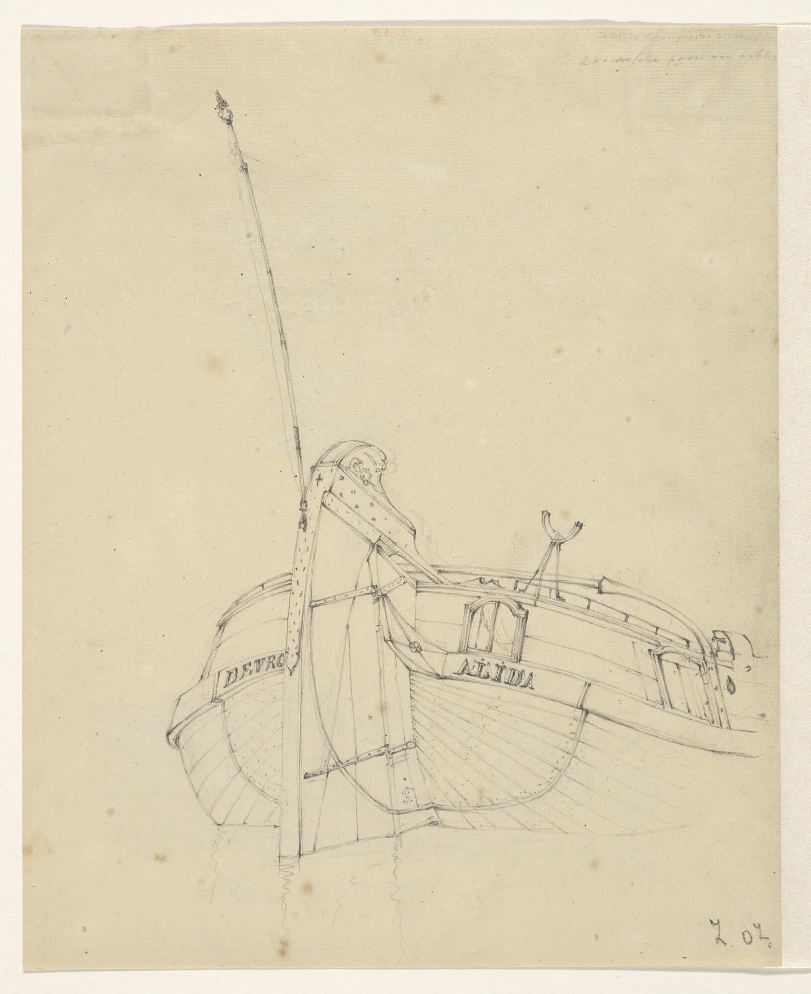 De paviljoenpoon "De Vrouw Alida". [Verso: schets van een beschoeiing en een houtzaagmolen.].