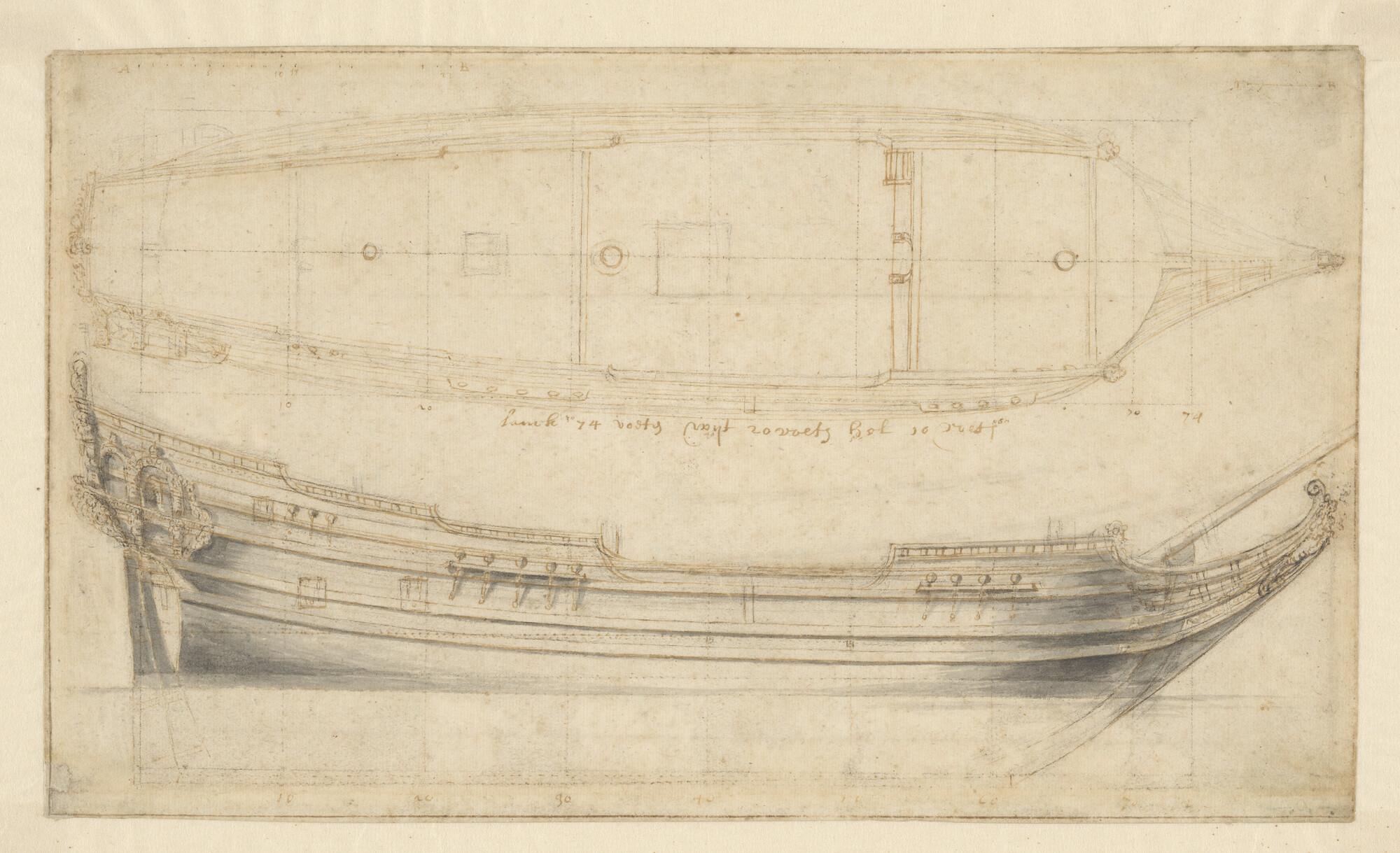 Zij- en bovenaanzicht van een pinasschip van 74 voet