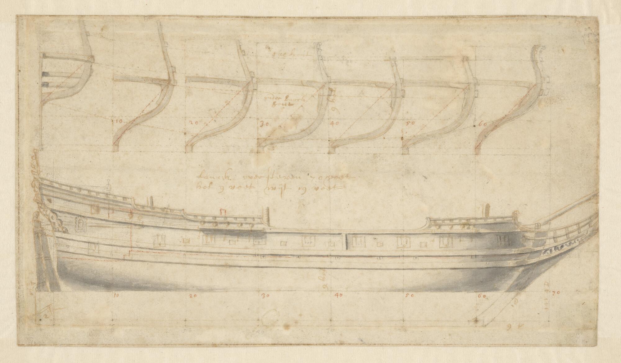 Zijaanzicht, spanten en grootspant van een pinasschip of jacht van 70 x 19 x 9 voet.