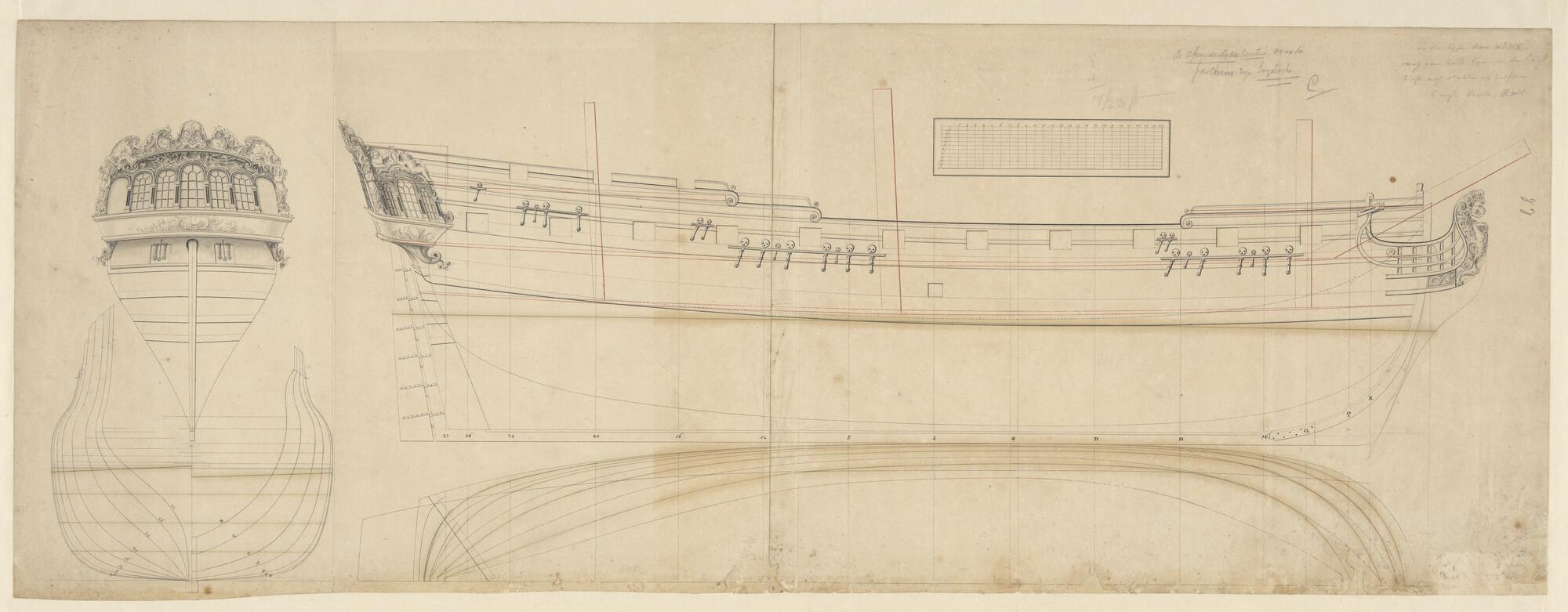 Spantenraam, waterlijnen, achteraanzicht, en zijaanzicht van een fregat van 22 stukken